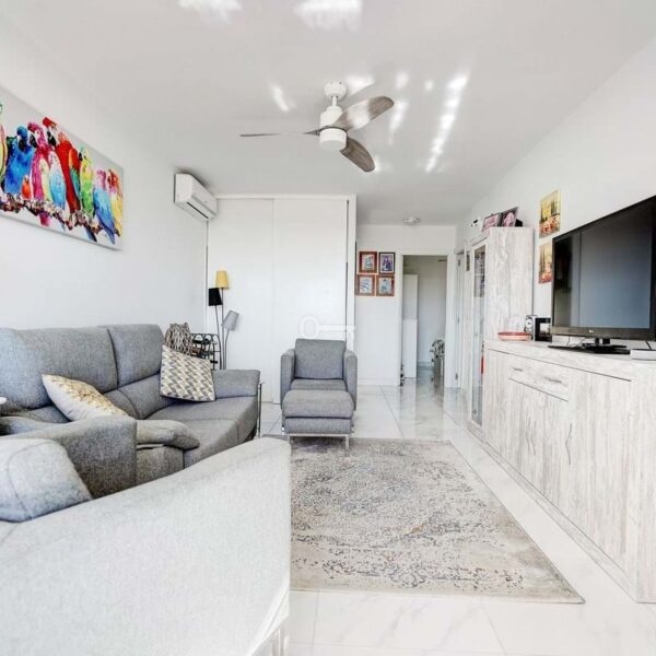 The interior layout is bright and modern. The lounge and dining area has large windows that bring in natural light and look out toward the sea, along with an electric fireplace for cooler months. The modern kitchen comes fully fitted with appliances and features a serving window that opens directly onto the terrace, which is especially useful when dining outside. There are two double bedrooms with hot and cold air conditioning, plus a full bathroom with a bathtub. All windows are double glazed and fitted with mosquito nets.