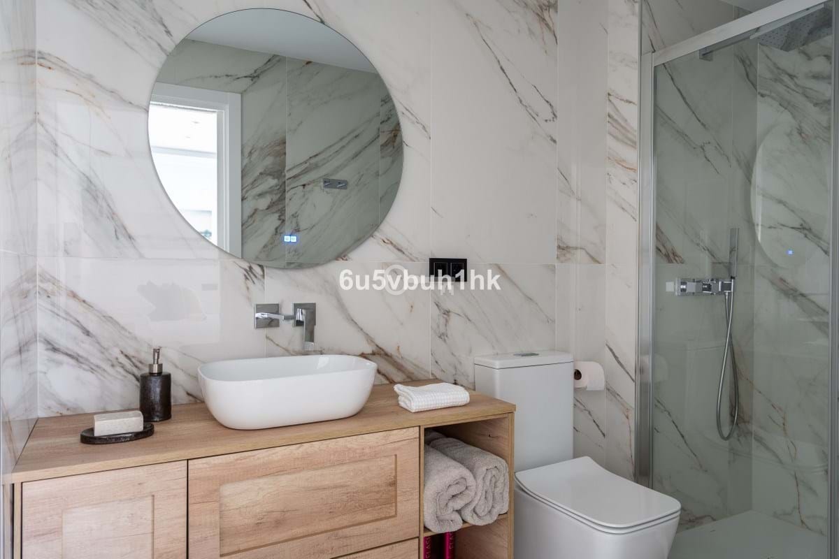 A staircase with led lights and sensors leads up to the first floor with two ensuite bedrooms. The first bedroom is large with plenty of built in wardrobes and a terrace with stunning sea views. The ensuite bathroom is stylish and a perfect size. The second bedroom also has built in wardrobes and a modern bathroom.