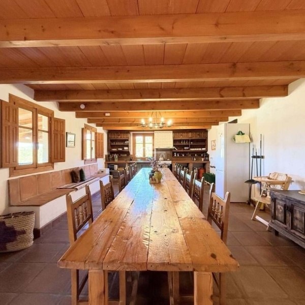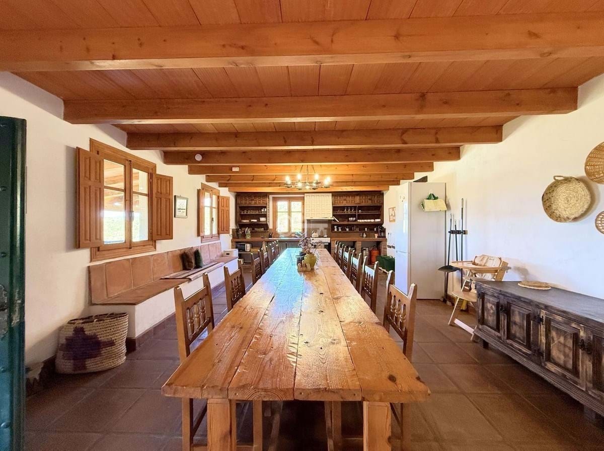 Ground floor: Spacious living-dining room with fireplace, large rustic kitchen with fireplace and ceramic hob, wine cellar, and a separate staff house with two bedrooms and a bathroom.