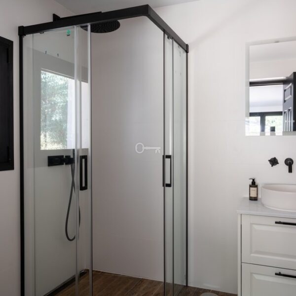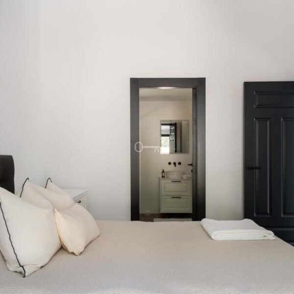 The villa offers 250 m² of interior space, complemented by a separate 30 m² guest studio. The interiors are bright, understated and thoughtfully finished, with a distinctly Scandinavian feel. On the ground floor there are two bedrooms with bathrooms, while a sculptural spiral staircase leads upstairs to an additional en-suite bedroom and an impressive principal suite framed by panoramic windows.