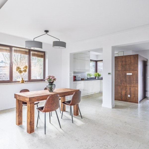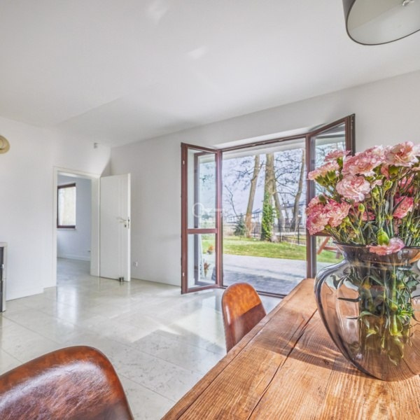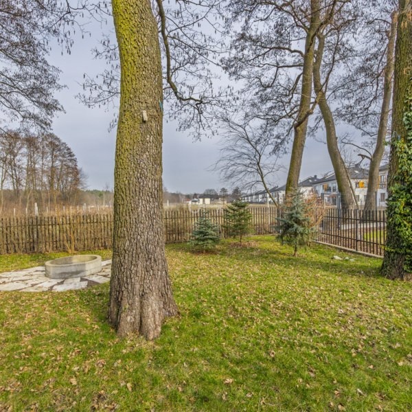 The house has been completely renovated and is located at the end of a gated community, which ensures silence and privacy. It is the only detached one in the development, surrounded by a self-contained, large, green garden. The interiors are bright and spacious, and the living room with a fireplace creates a warm, cozy atmosphere.