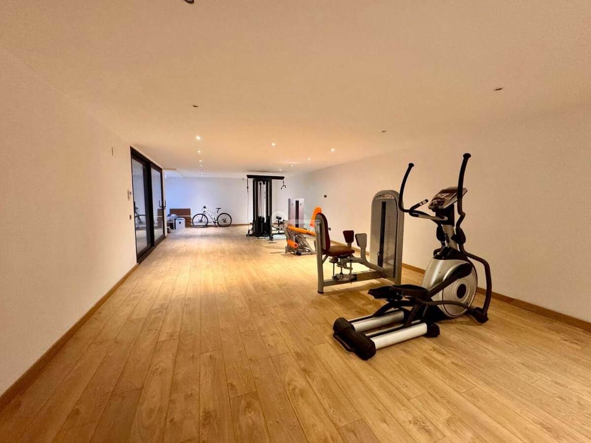 The lower level offers a private gym area along with an additional bathroom, creating a perfect space for wellness and relaxation.