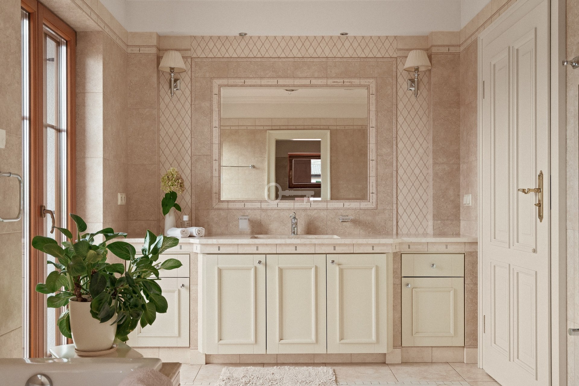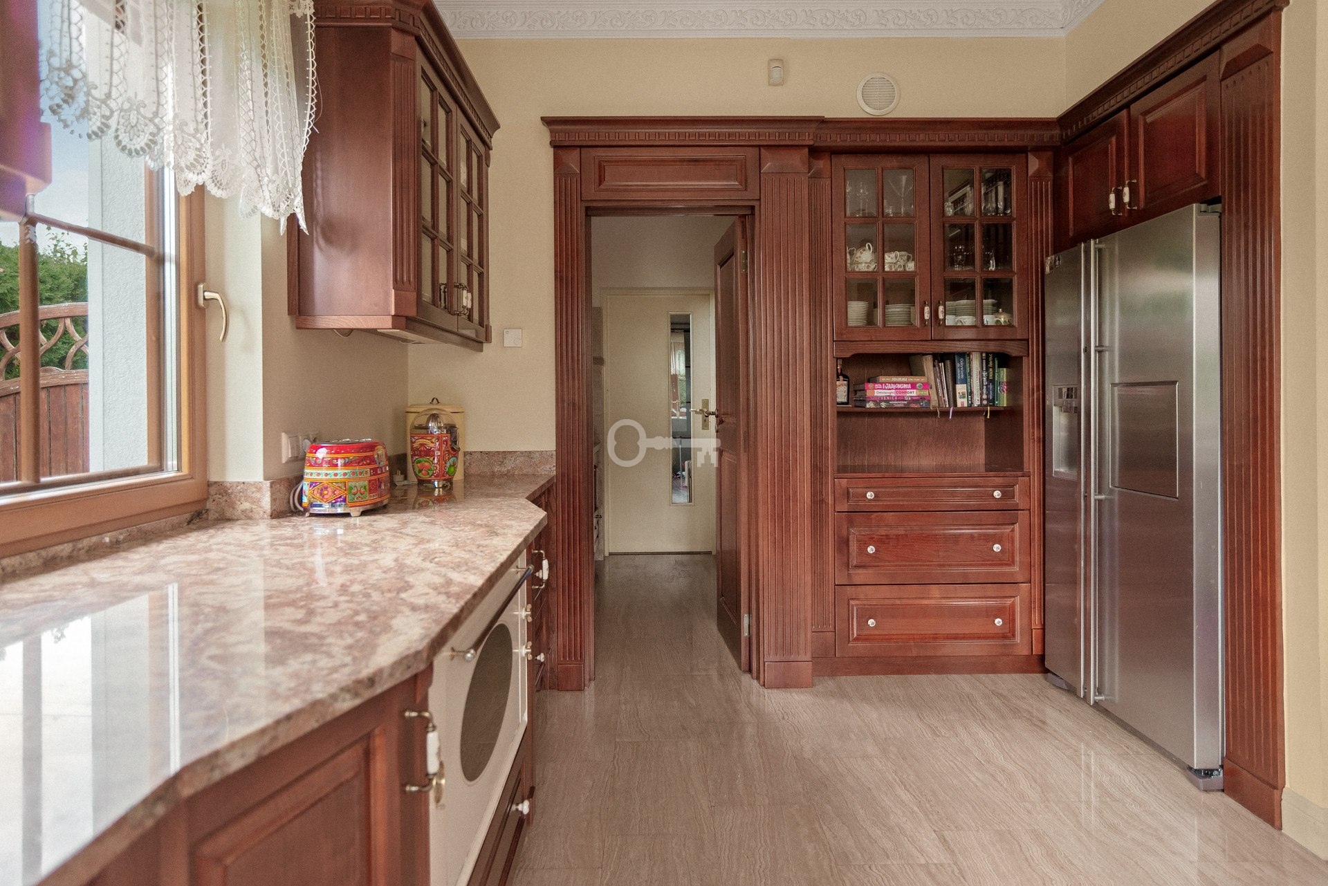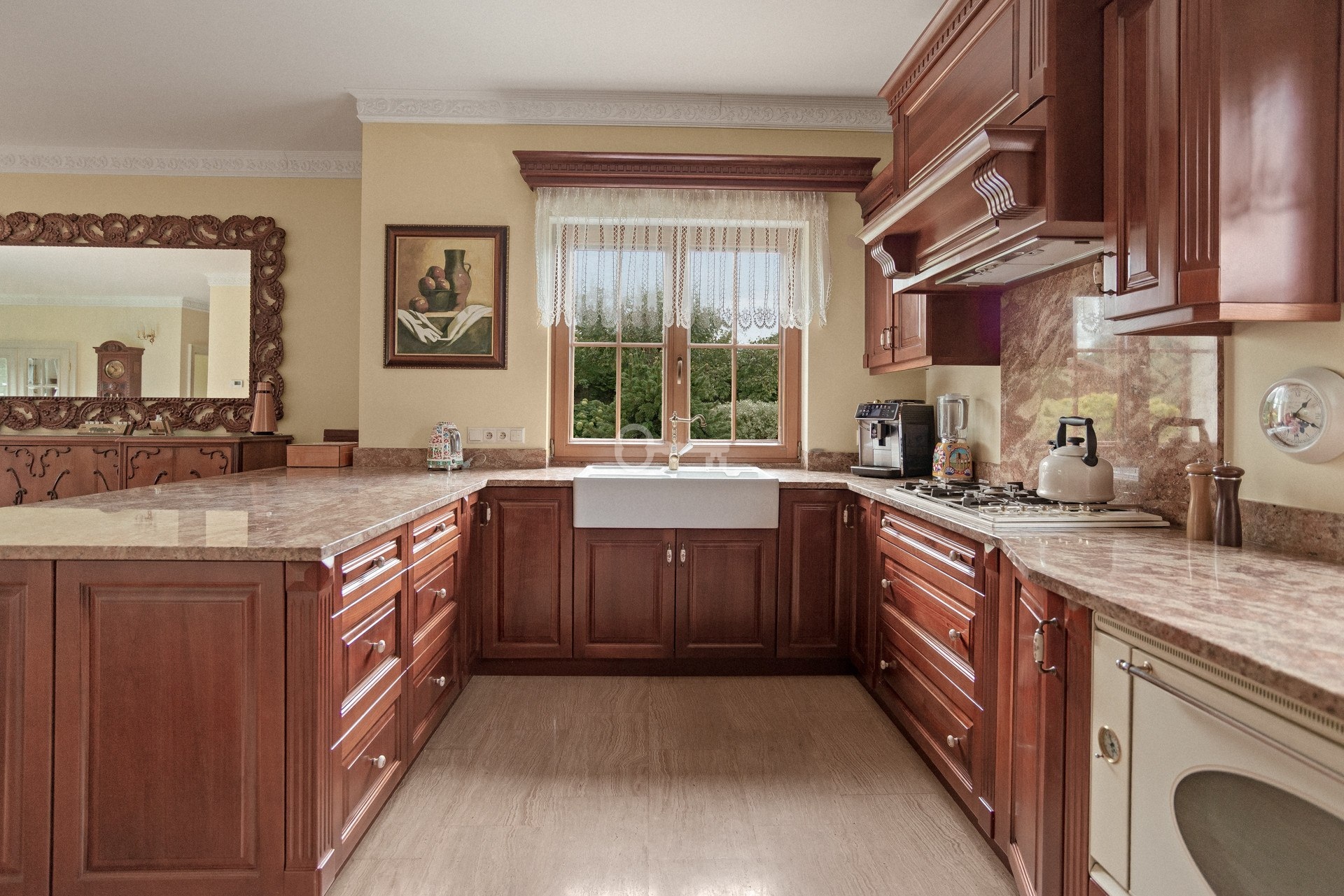 Bathrooms designed by an interior designer. Energy-efficient fireplace made of precious stone. Kitchen and built-in furniture made of solid cherry wood to order.