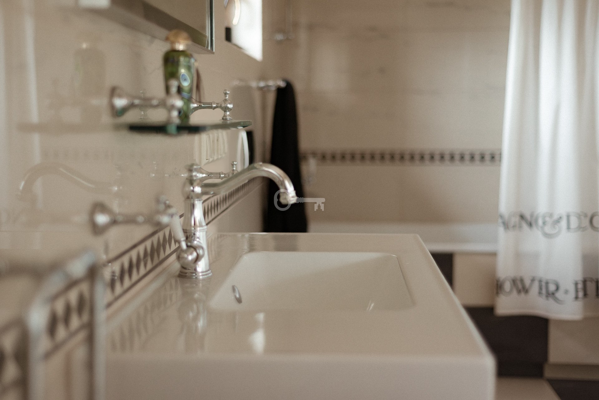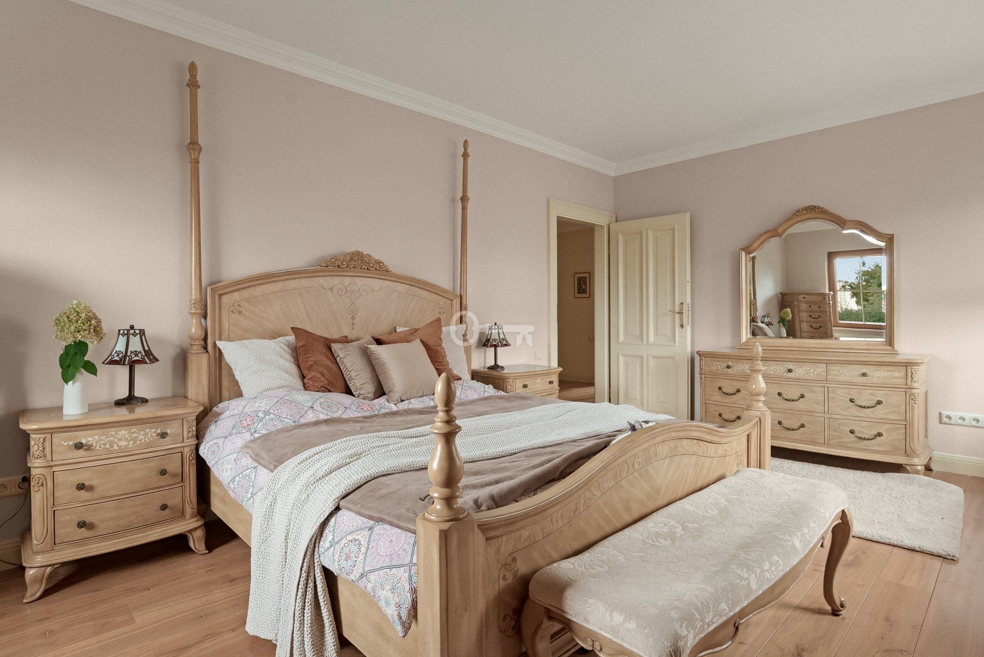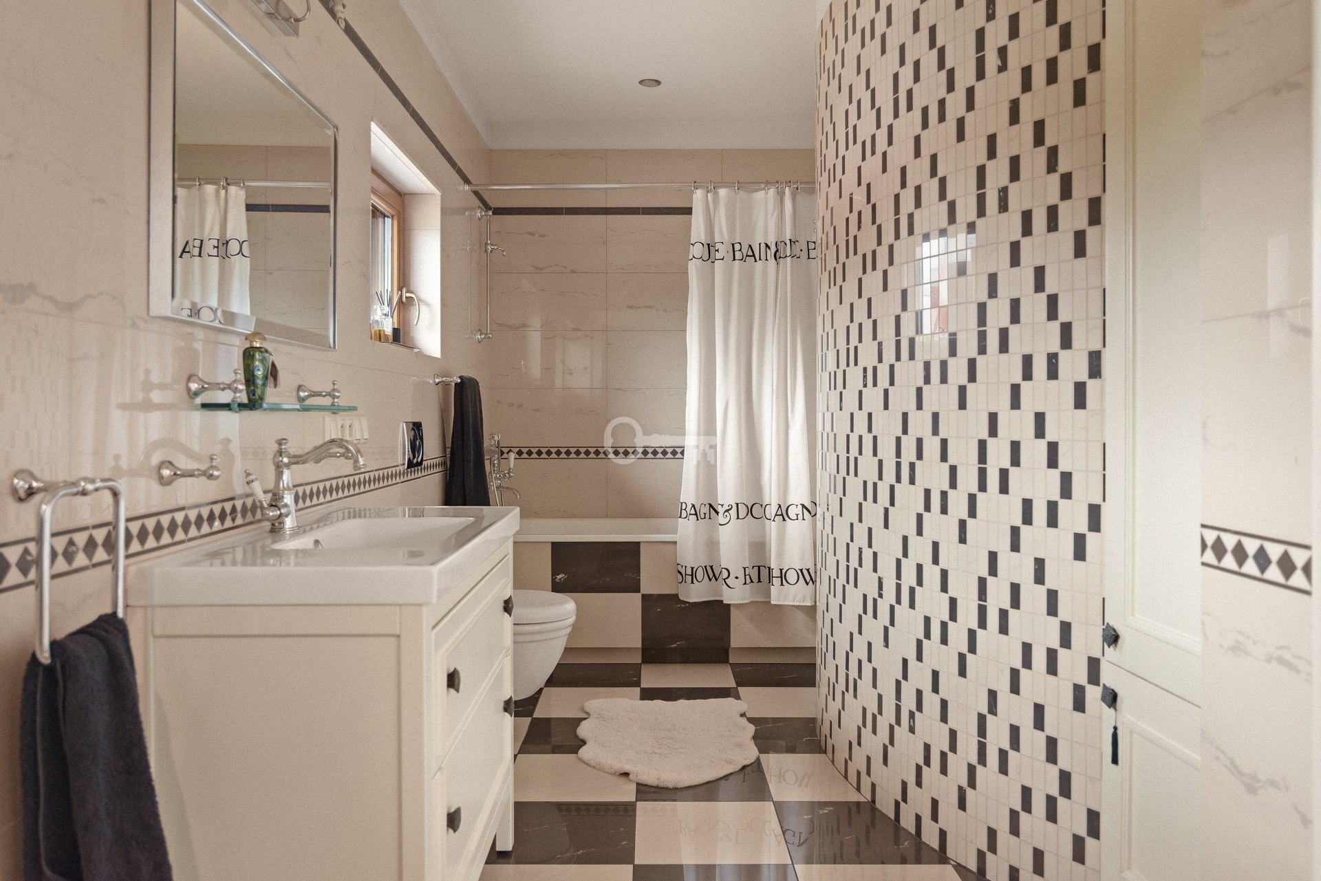 Bathrooms designed by an interior designer. Energy-efficient fireplace made of precious stone. Kitchen and built-in furniture made of solid cherry wood to order.