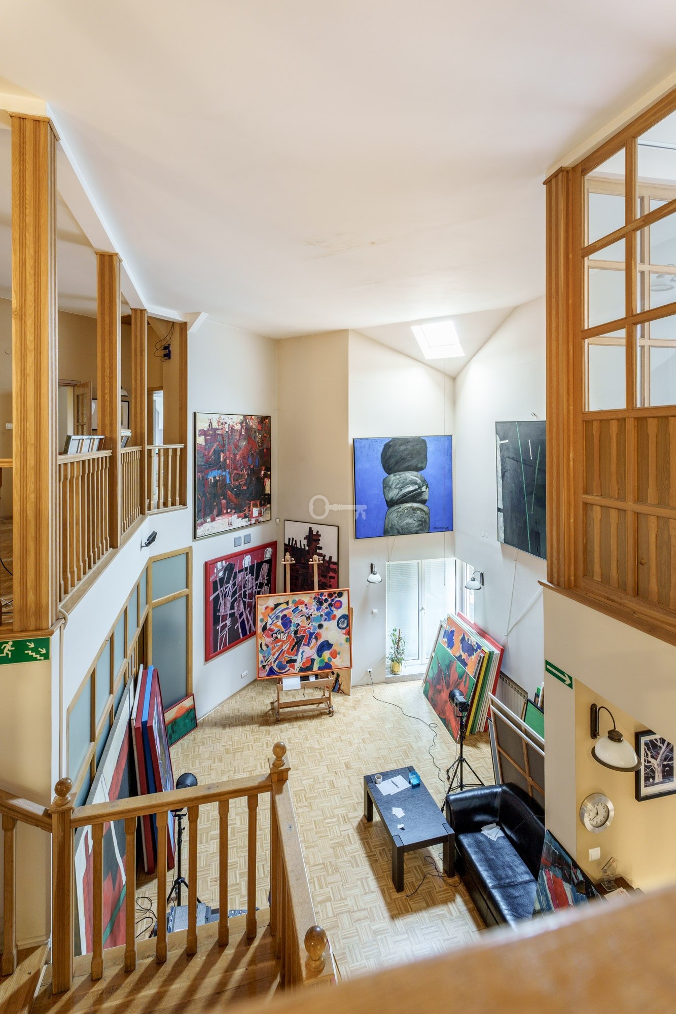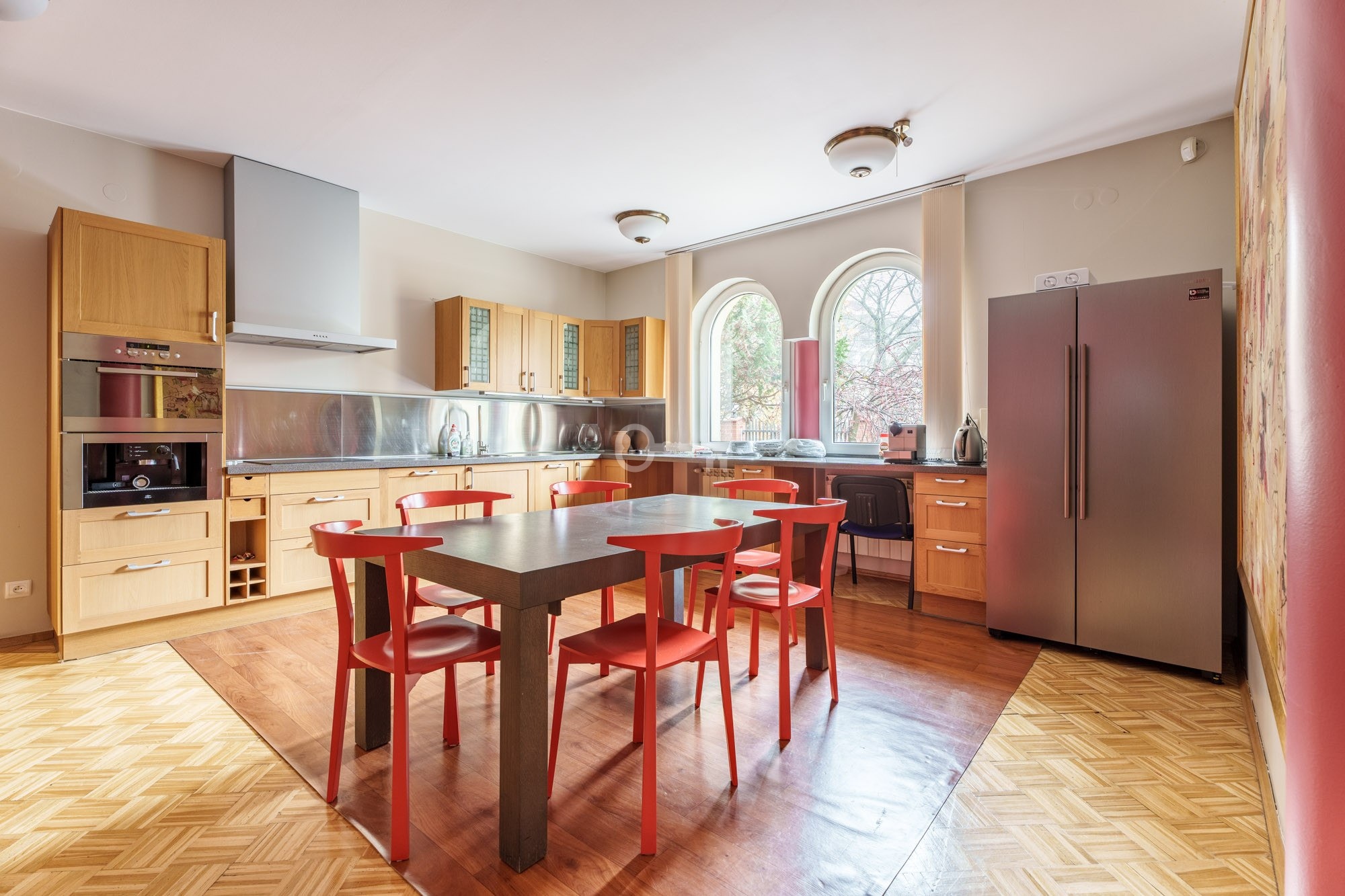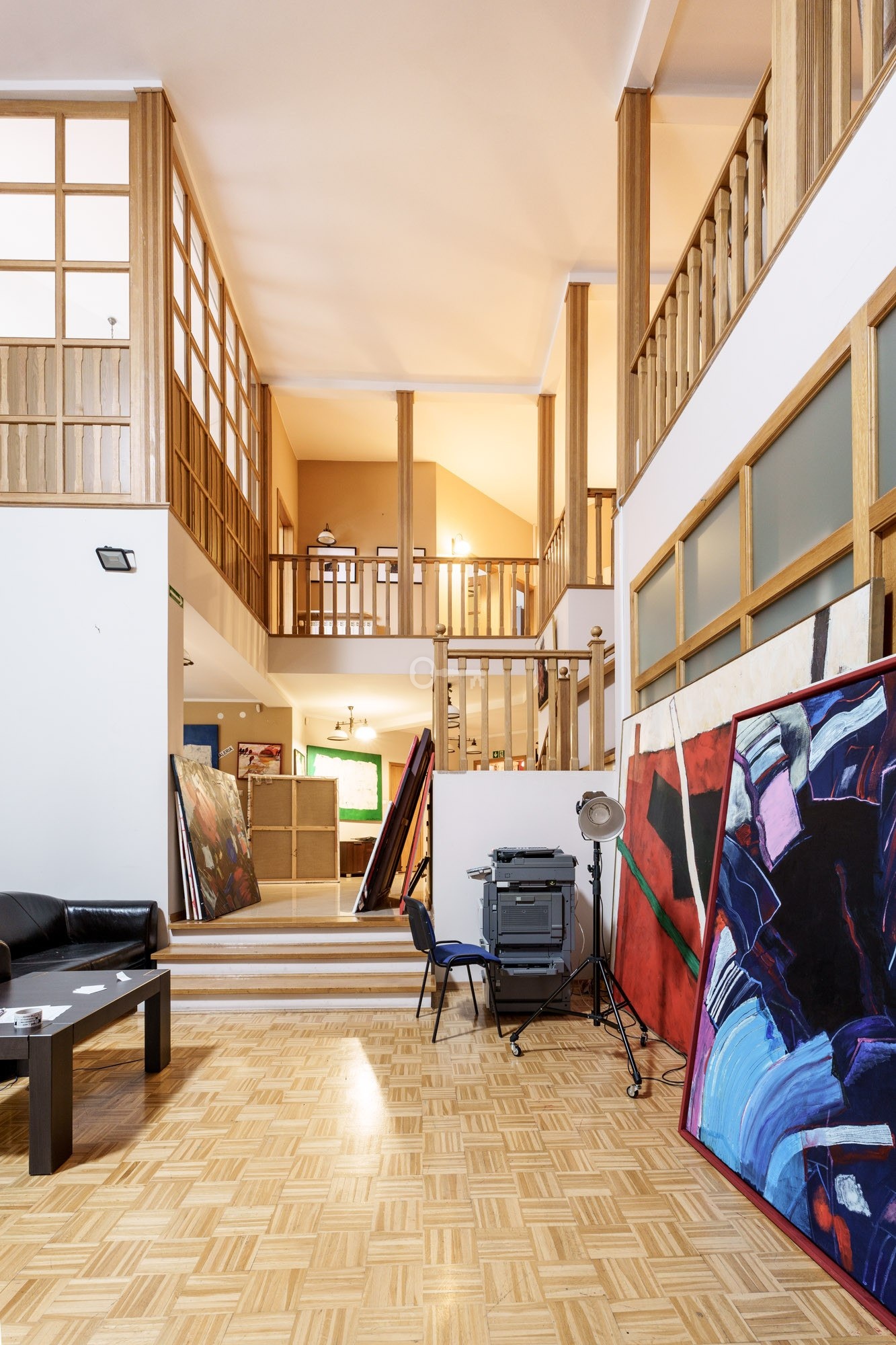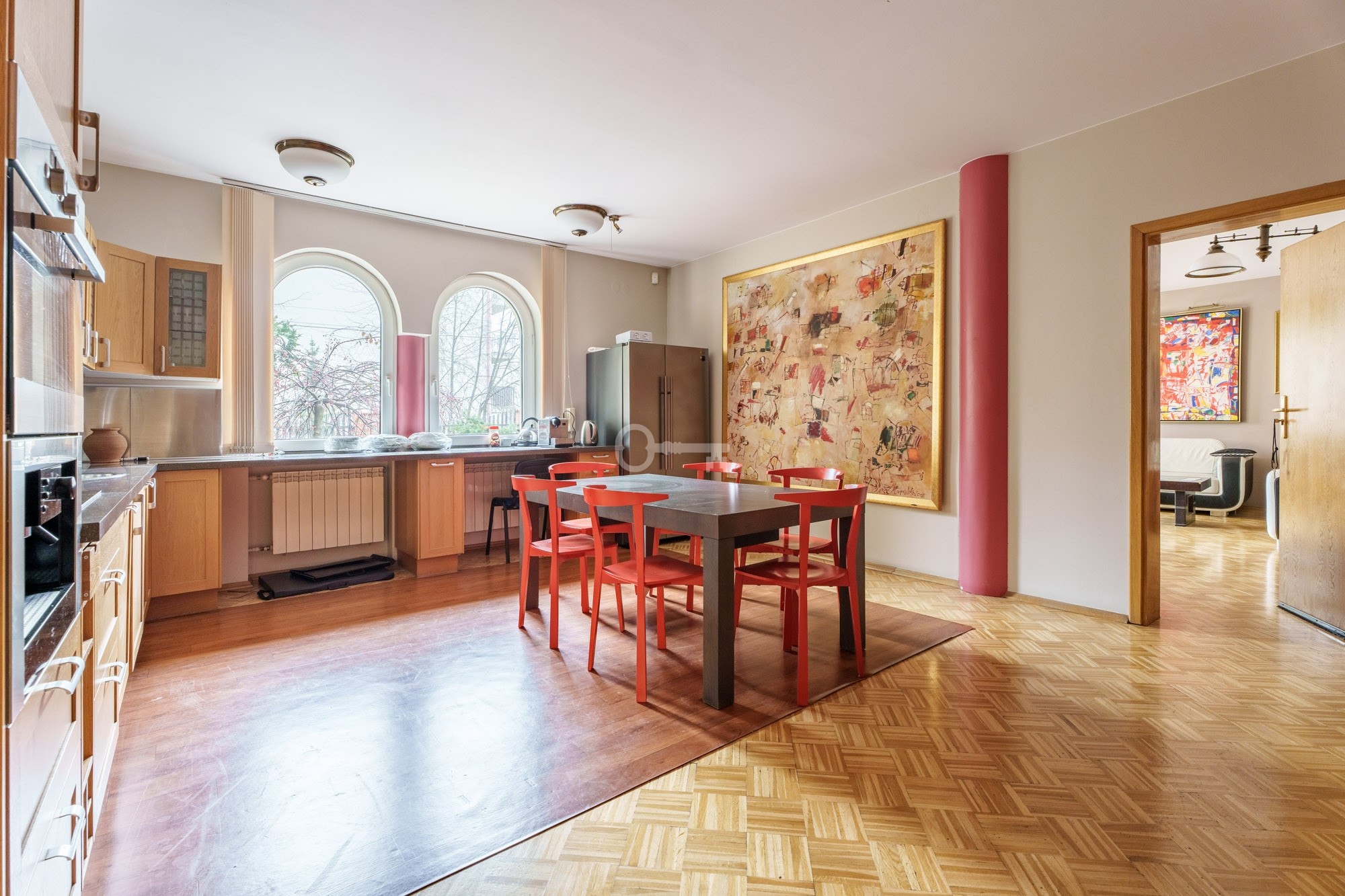 Spacious house on three floors with great potential. Living room at the highest point is about 7m high. Floors finished with wood mosaic. In kitchens, bathrooms, lobby, and basement floors tiled with stoneware and terracotta. On the first floor and attic floor heating. Stairs and balustrades in the attic finished with wood. Wooden door frames.