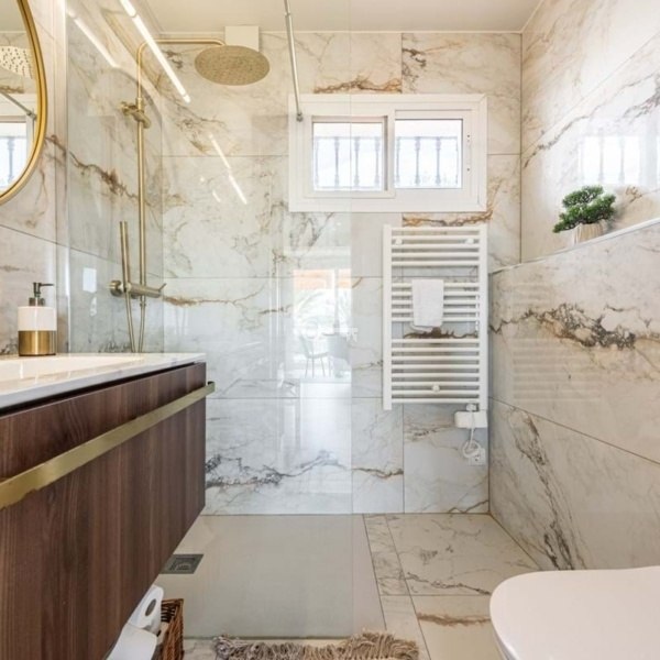 Walking through the living room you enter the terrace with a small splash pool and sunbeds. A small step from the terrace and you have a beautiful outdoor shower in total privacy.