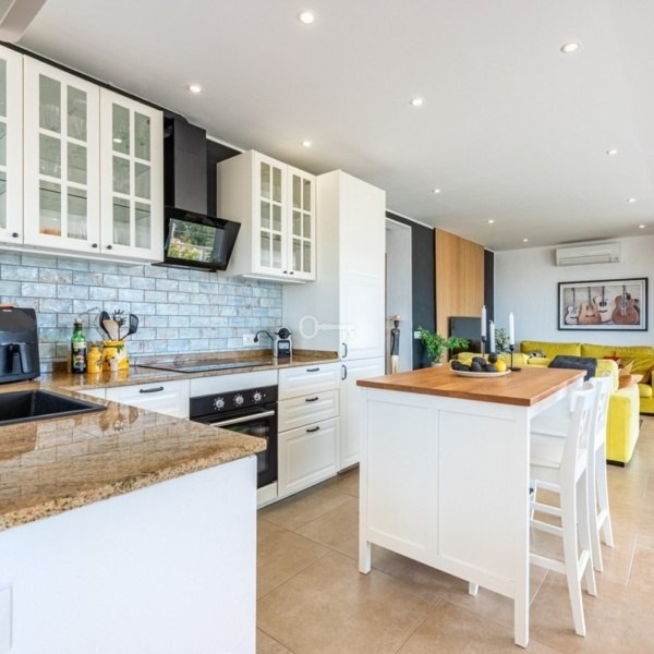 Entering the small hallway, the open plan kitchen/living room opens and here you get a breath taking, total panoramic sea view.