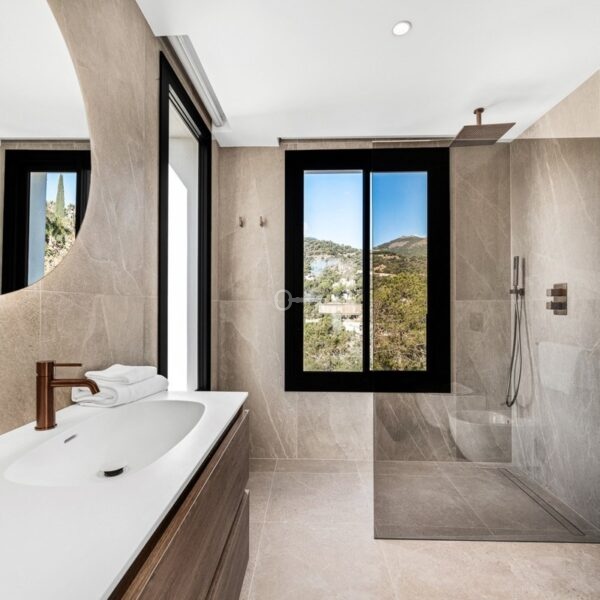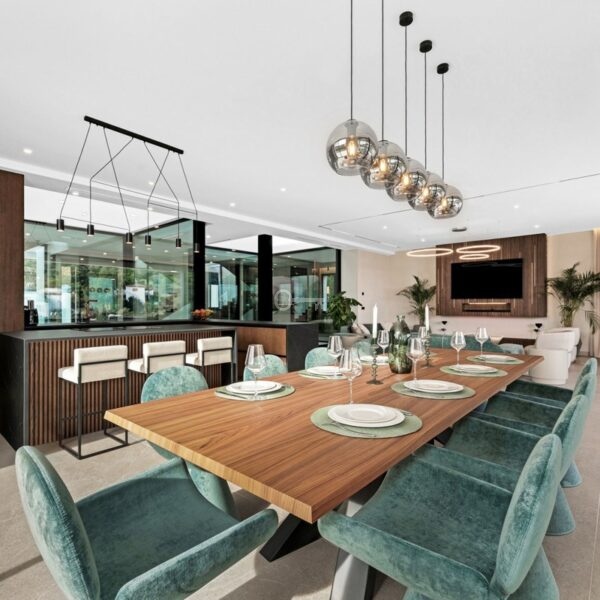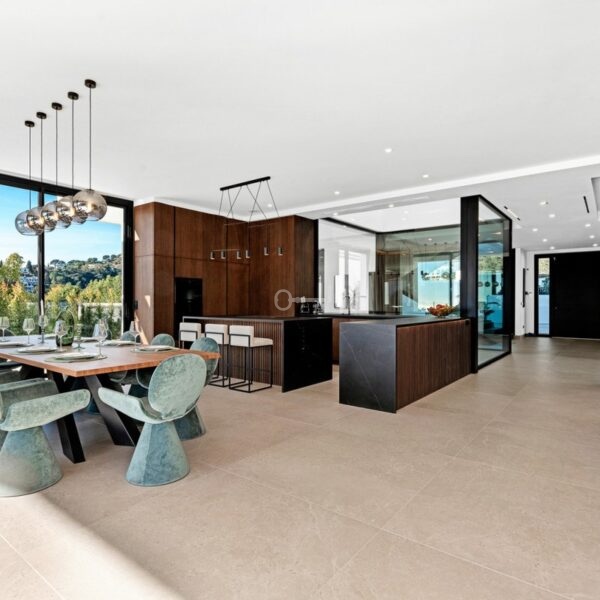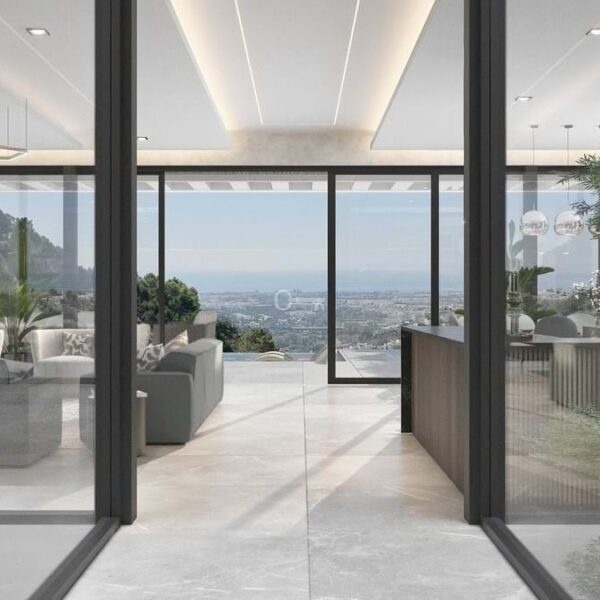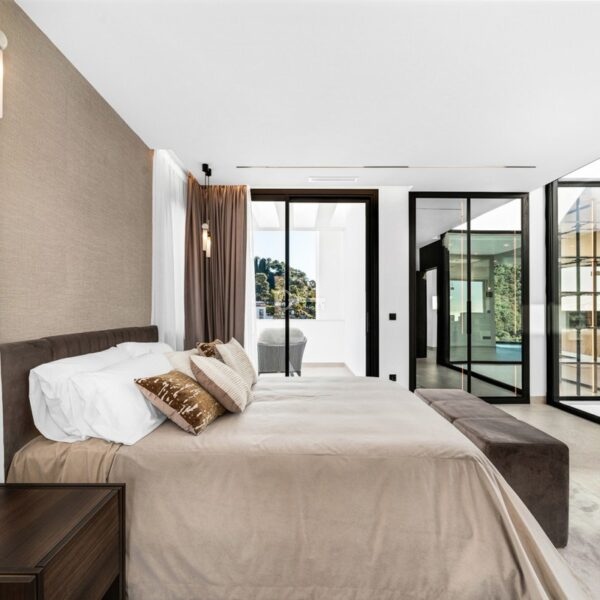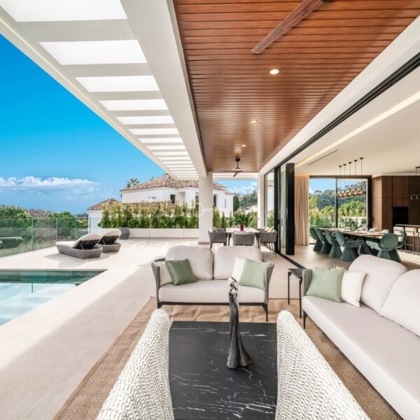 This contemporary villa in Madroñal, Benahavís offers breathtaking panoramic sea views within an exclusive gated community with 24-hour security.