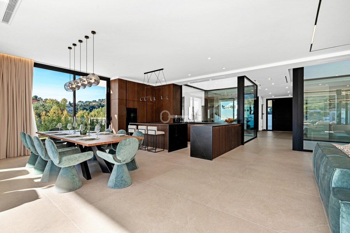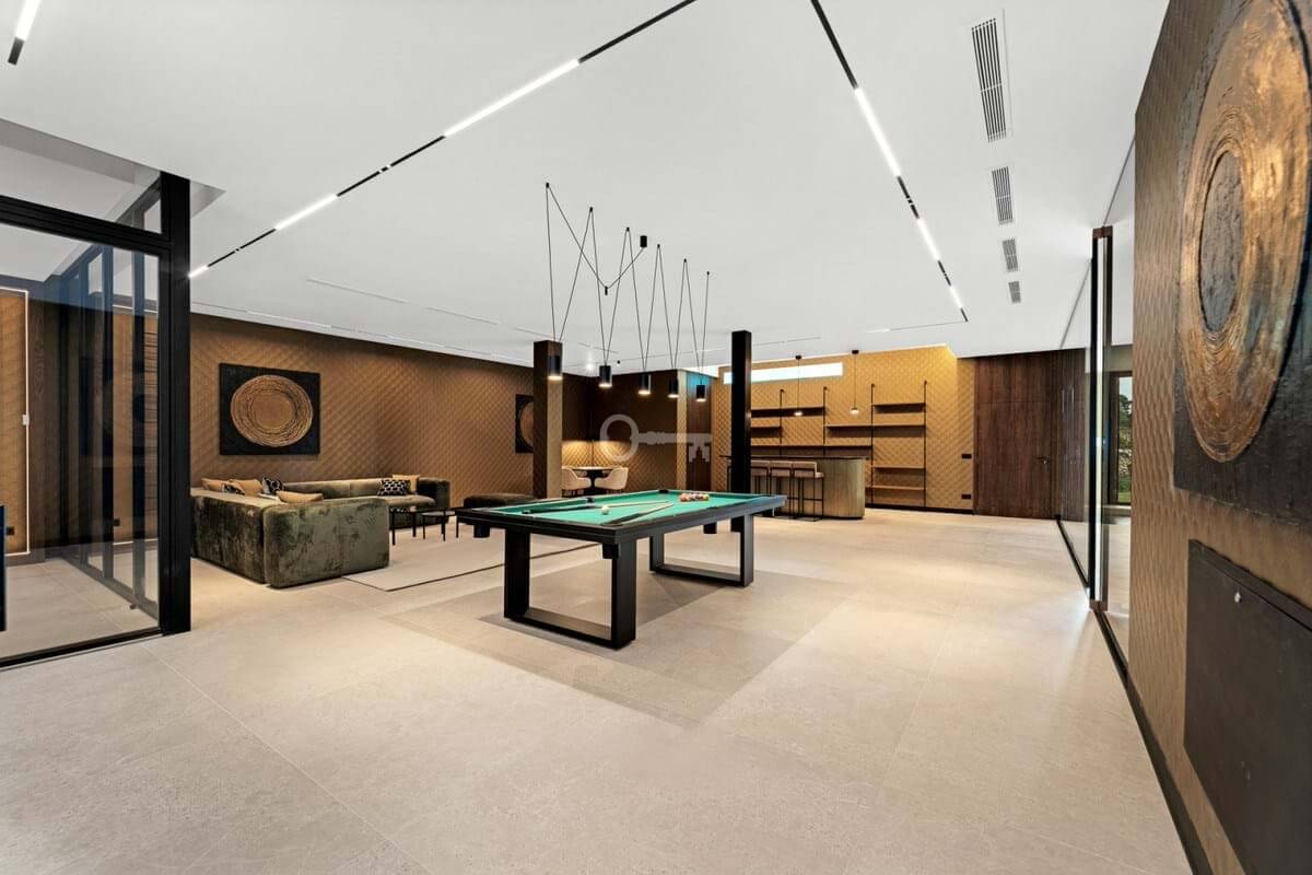 The home is spread over three levels and includes a luxury spa with indoor heated pool, Finnish sauna, Turkish bath, a fully equipped gym, games room, bar, and wine cellar. Two glass cubes and floor-to-ceiling windows create bright, open spaces filled with natural light.