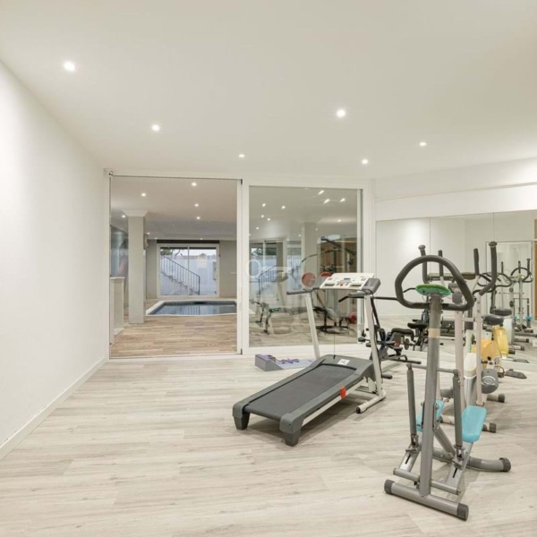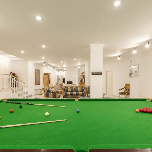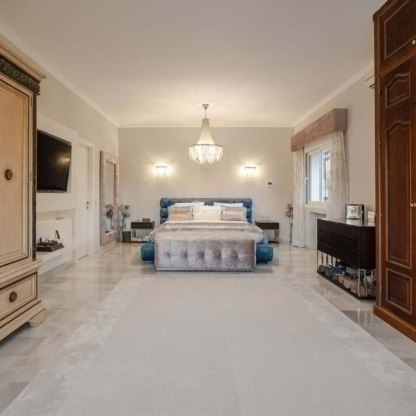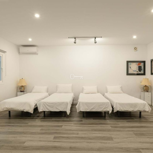One of the standout features of this villa is the expansive outdoor area. The huge outdoor pool beckons you to take a refreshing dip or simply lounge by the water’s edge, basking in the warm Mediterranean sun. With a beach entrance, the pool exudes a tropical paradise vibe, creating a delightful space for relaxation and entertainment.
