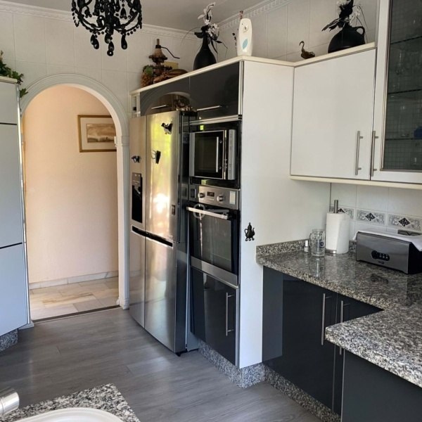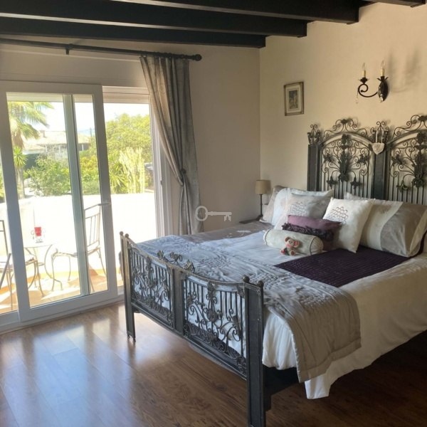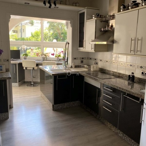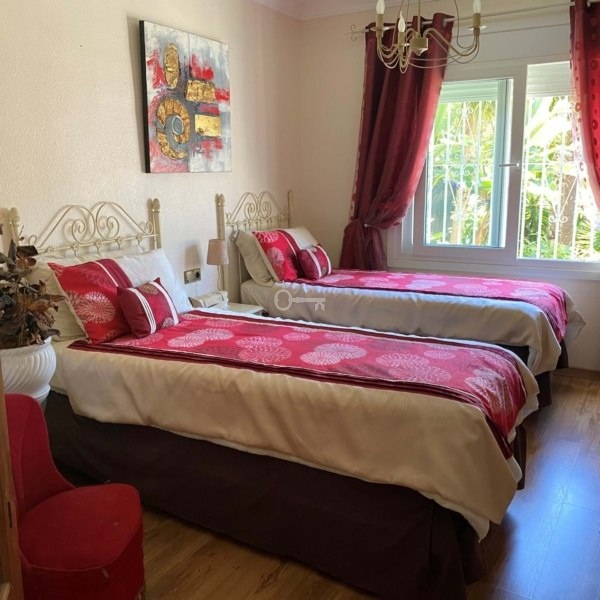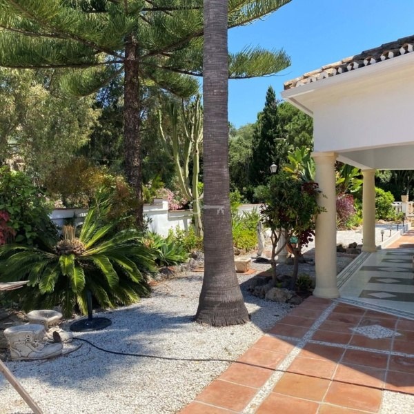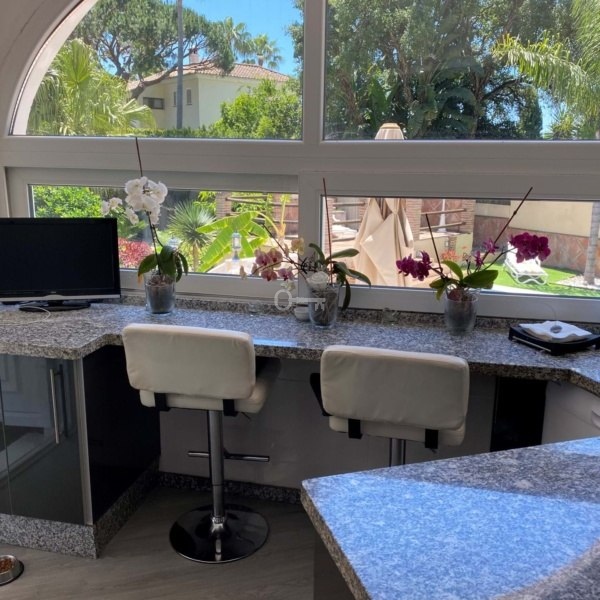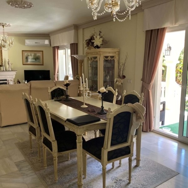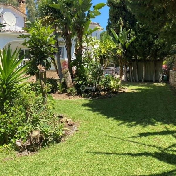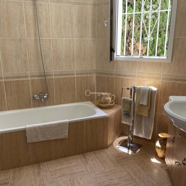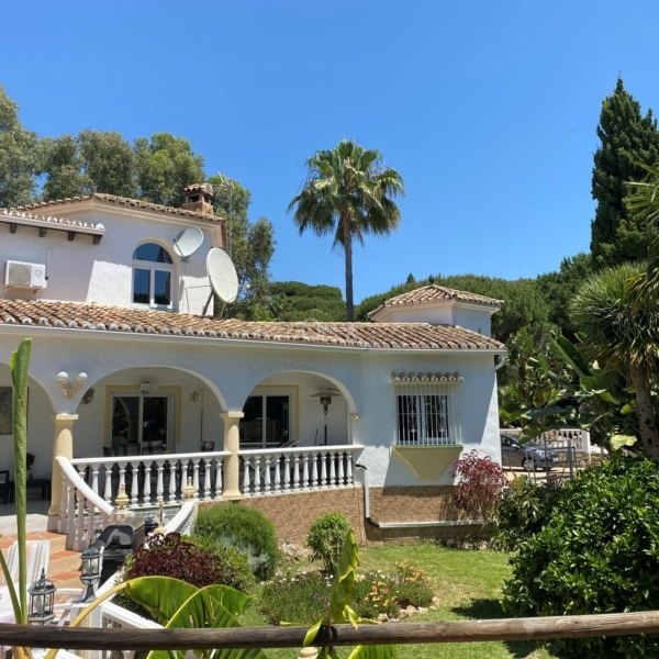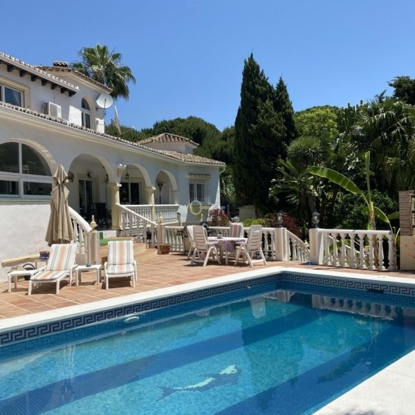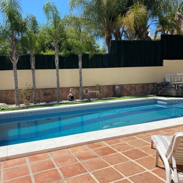 This villa is located on a large mature plot in a quiet residential area of Elviria, close to amenities and the beach. The property comprises an entrance hall, living room with fireplace, dining area, refurbished kitchen with breakfast bar and a large covered terrace overlooking the swimming pool. On the main floor there are 3 bedrooms, 2 bathrooms and guest toilet. The master suite is located on the first floor with an en-suite bathroom, a small balcony and partial sea views. Adjacent to the bedroom is another room which is currently used as a gym but could be used as extra wardrobe space or nursery.