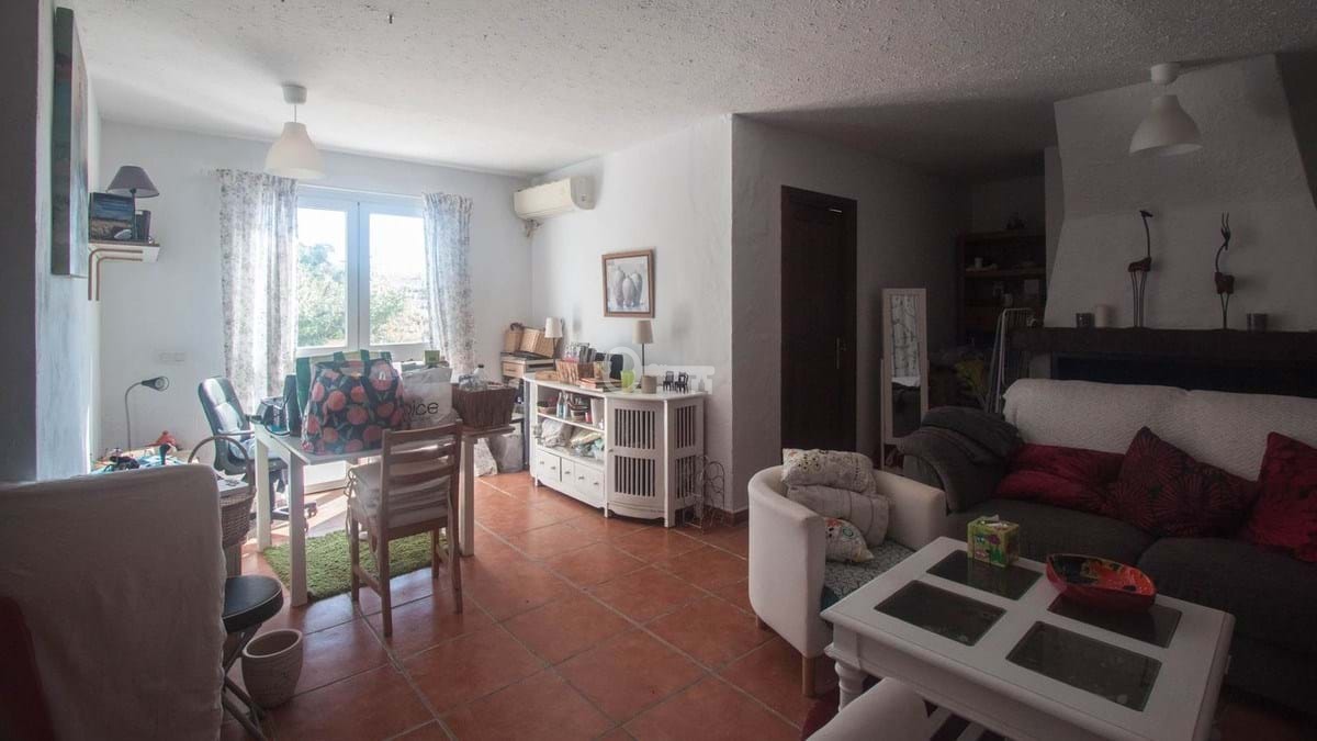 Bright and spacious living room with fireplace, large windows, and sliding glass doors that open onto a covered porch with direct access to the pool and gardens ideal for enjoying the sea views all year round.