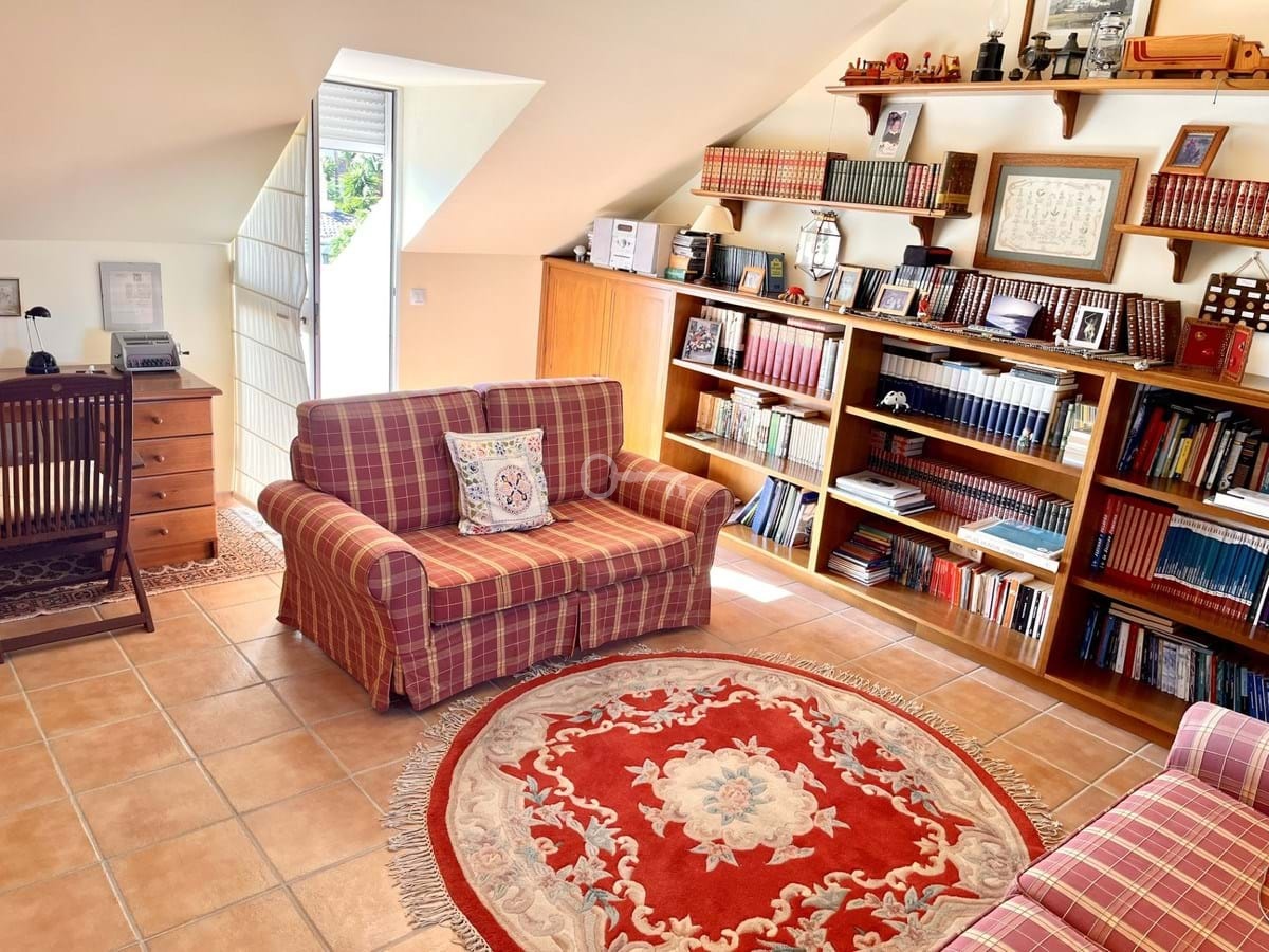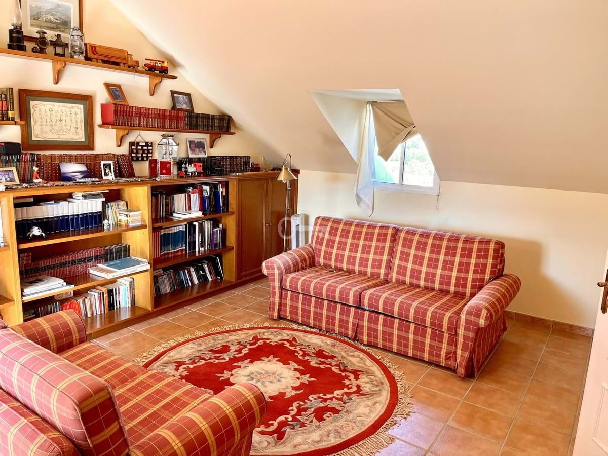 The residence is set within a gated community featuring mature communal gardens, a large swimming pool with sun loungers, and designated green areas for childrens games. The property boasts a private entrance, a carport for secure parking, and a charming porch. On the ground floor, the fully fitted kitchen with a serving hatch is complemented by 1 guest toilet and a spacious living room with a fireplace. This inviting living space connects seamlessly to a large covered terrace and a private east-facing garden, offering delightful views and a tranquil setting for outdoor relaxation.