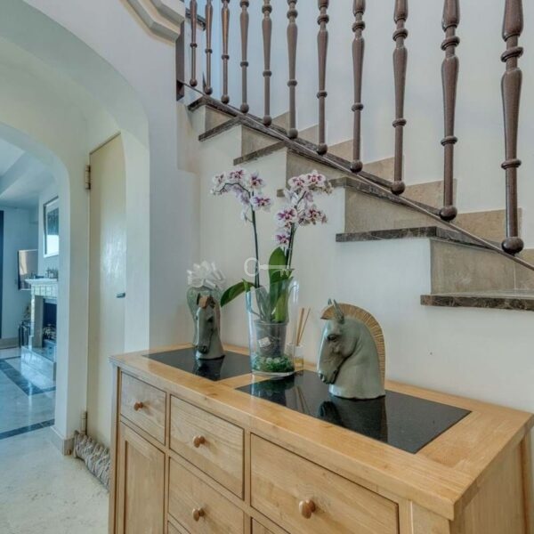 A welcoming double-height entrance hall sets an elegant tone from the outset. The fully fitted kitchen is separate from the main living areas and includes its own dedicated dining space deal for everyday meals and family gatherings. The spacious living and dining room leads directly onto a covered terrace, a lovely place to relax while enjoying peaceful garden and sea views.