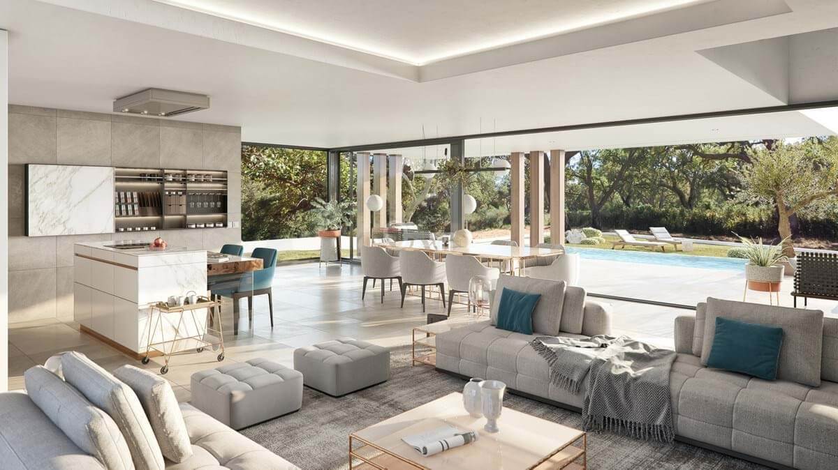 Inside, the villa is organised around open and flowing spaces, where the living room, dining area and kitchen coexist within a single spacious and light-filled environment, designed for both everyday comfort and social enjoyment. Natural light enters through large floor-to-ceiling windows, transforming each space throughout the day and creating a warm and sophisticated atmosphere. The use of neutral tones, combined with high-quality materials and carefully selected details, brings a sense of harmony and understated elegance that defines the character of the home.