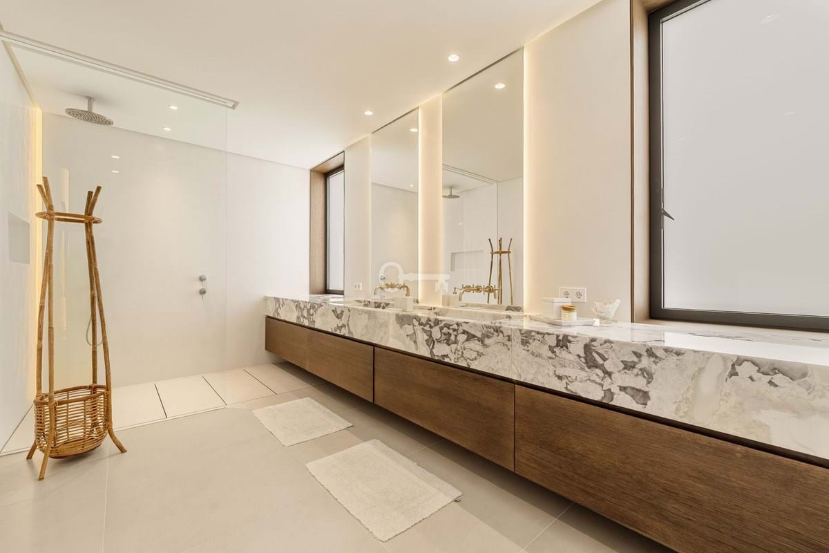 Accommodation includes six well-proportioned bedrooms, highlighted by a primary suite with a walk-in wardrobe and luxurious en-suite bathroom. A dedicated home office provides an efficient workspace, while an entertainment level with a private gym, media area, and leisure facilities adds flexibility for modern lifestyles. Every room is planned for comfort and functionality, with attention to detail evident in the materials and finishes.