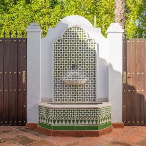 The villa is accessed through an automated gate, showcasing its elegant Andalusian façade. On the right side of the entrance, there is ample parking space along with a covered garage for added convenience.