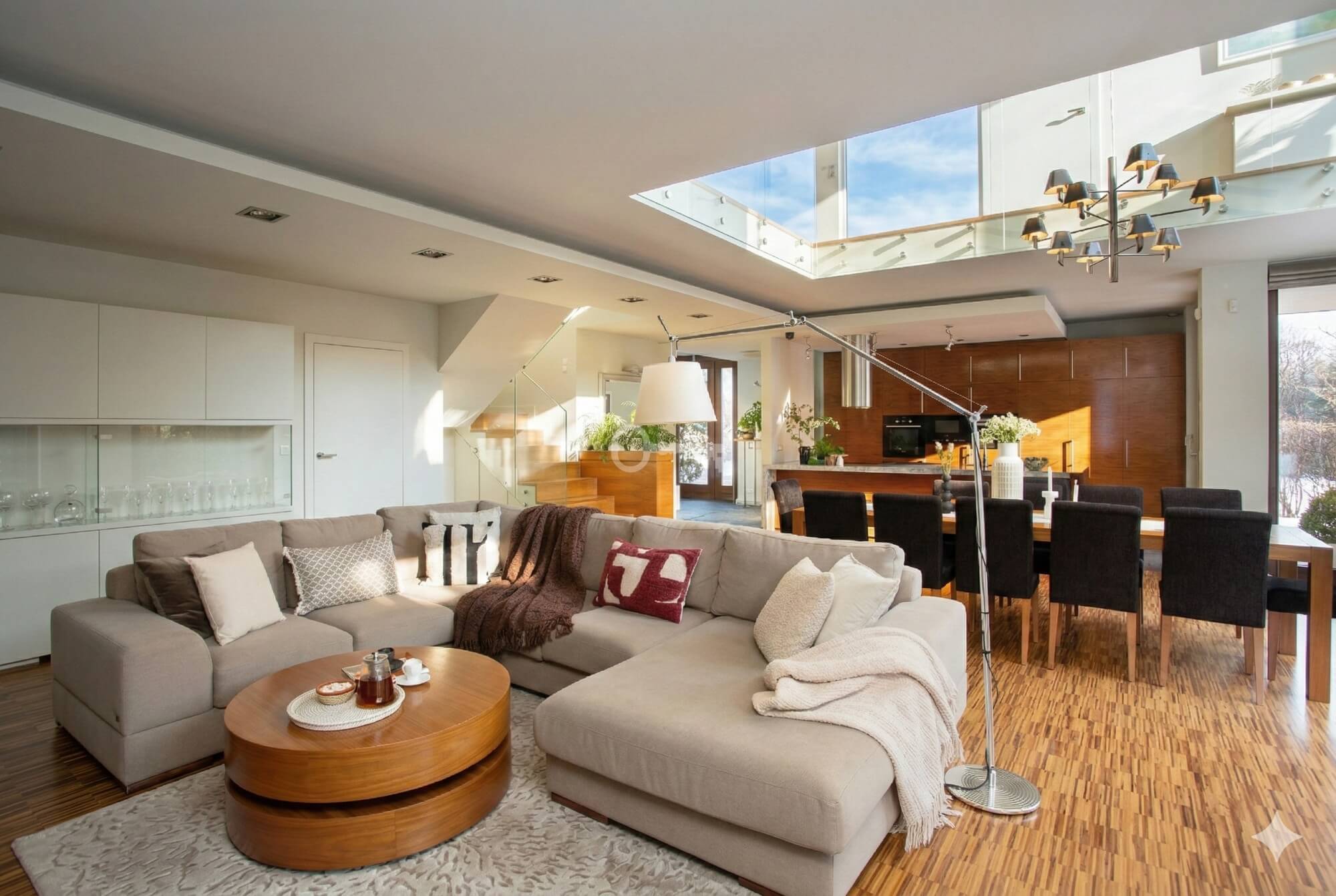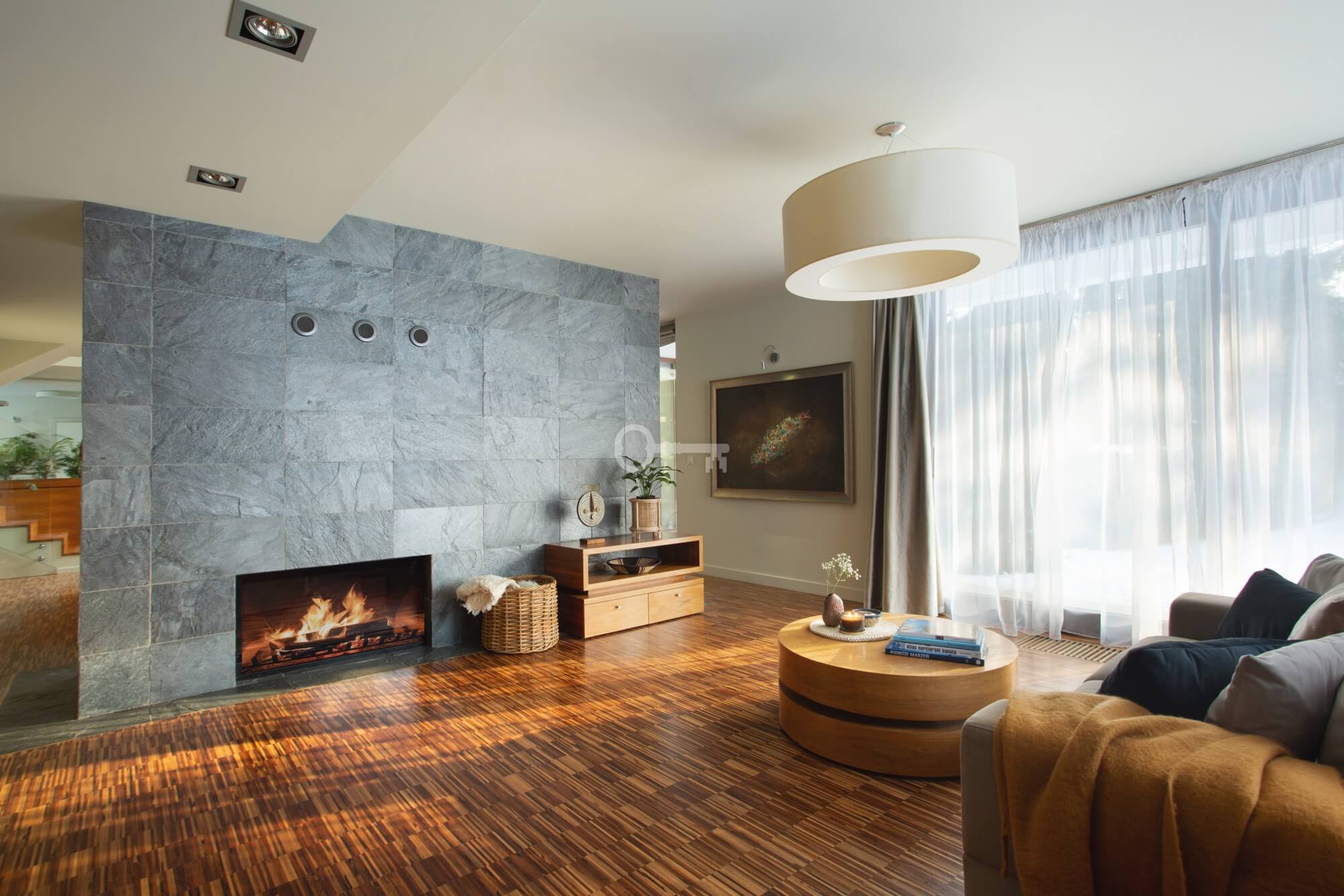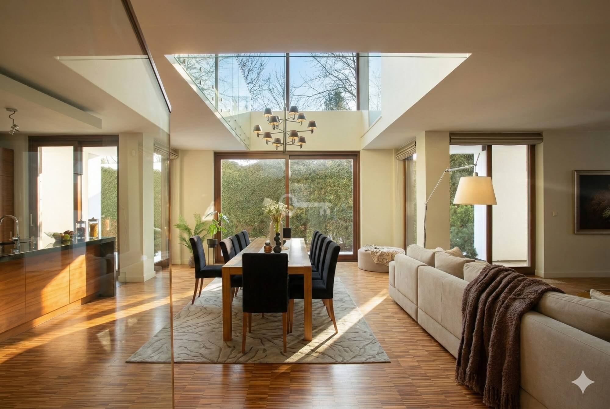 Wyobraź sobie poranek w salonie, gdzie sufit sięga 7 metrów wysokości. To nie jest pokój dzienny – to Twoja prywatna katedra światła. Przeszklone ściany zacierają granicę między luksusowym wnętrzem a ogrodem, a kominek wieczorami staje się sercem domu, wokół którego buduje się najpiękniejsze wspomnienia.