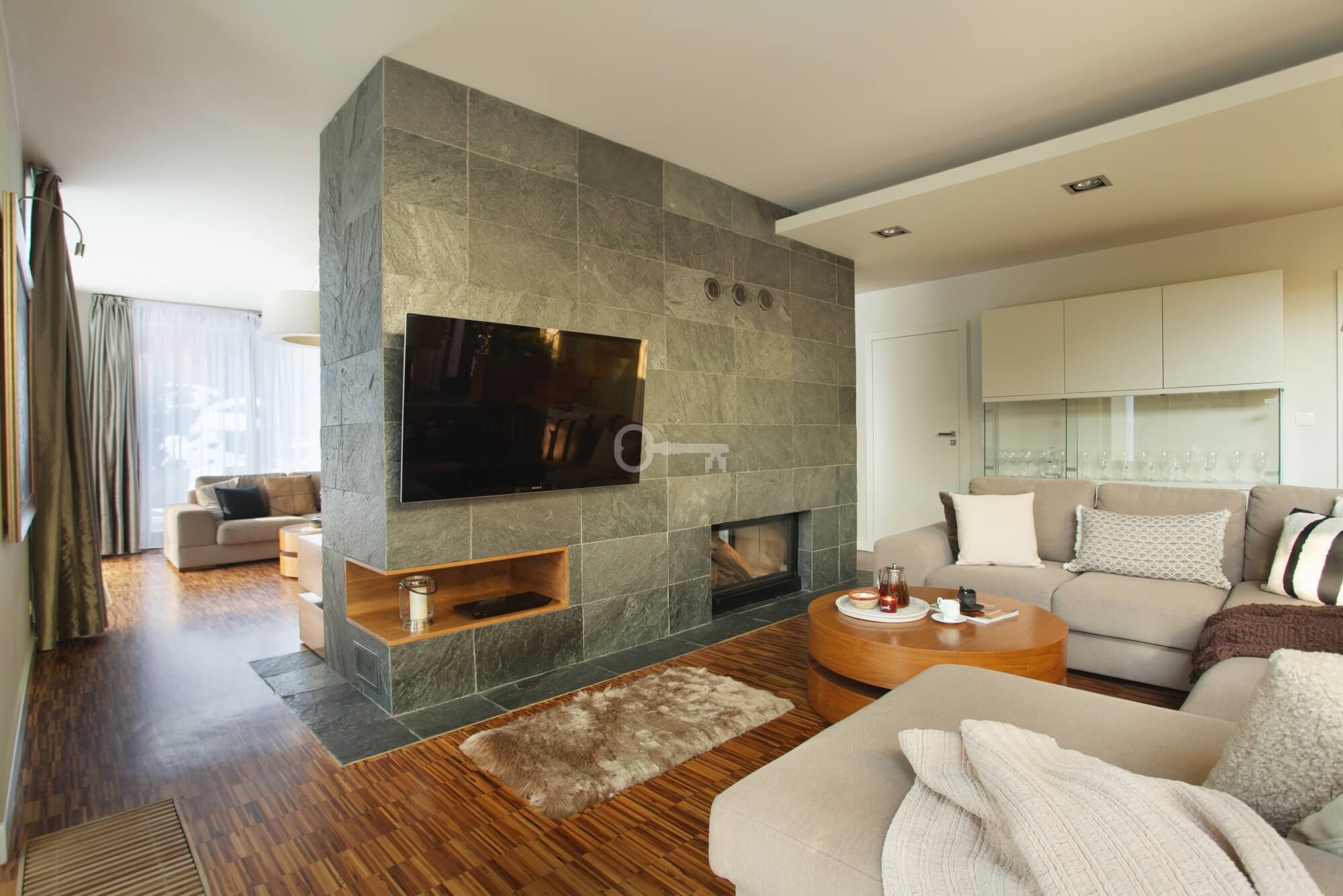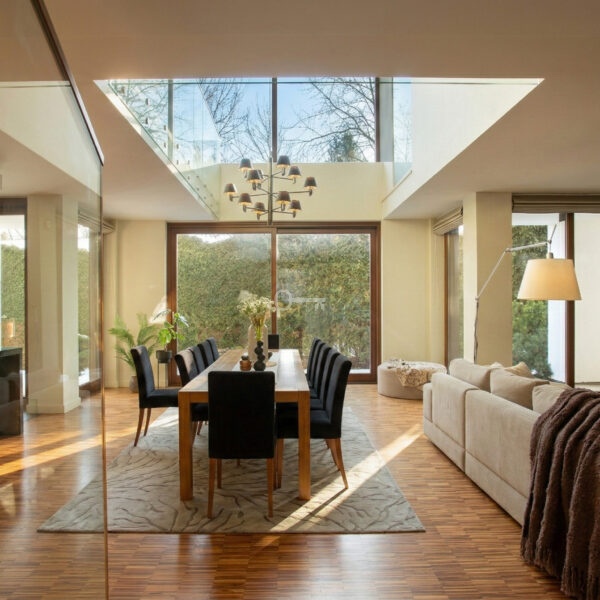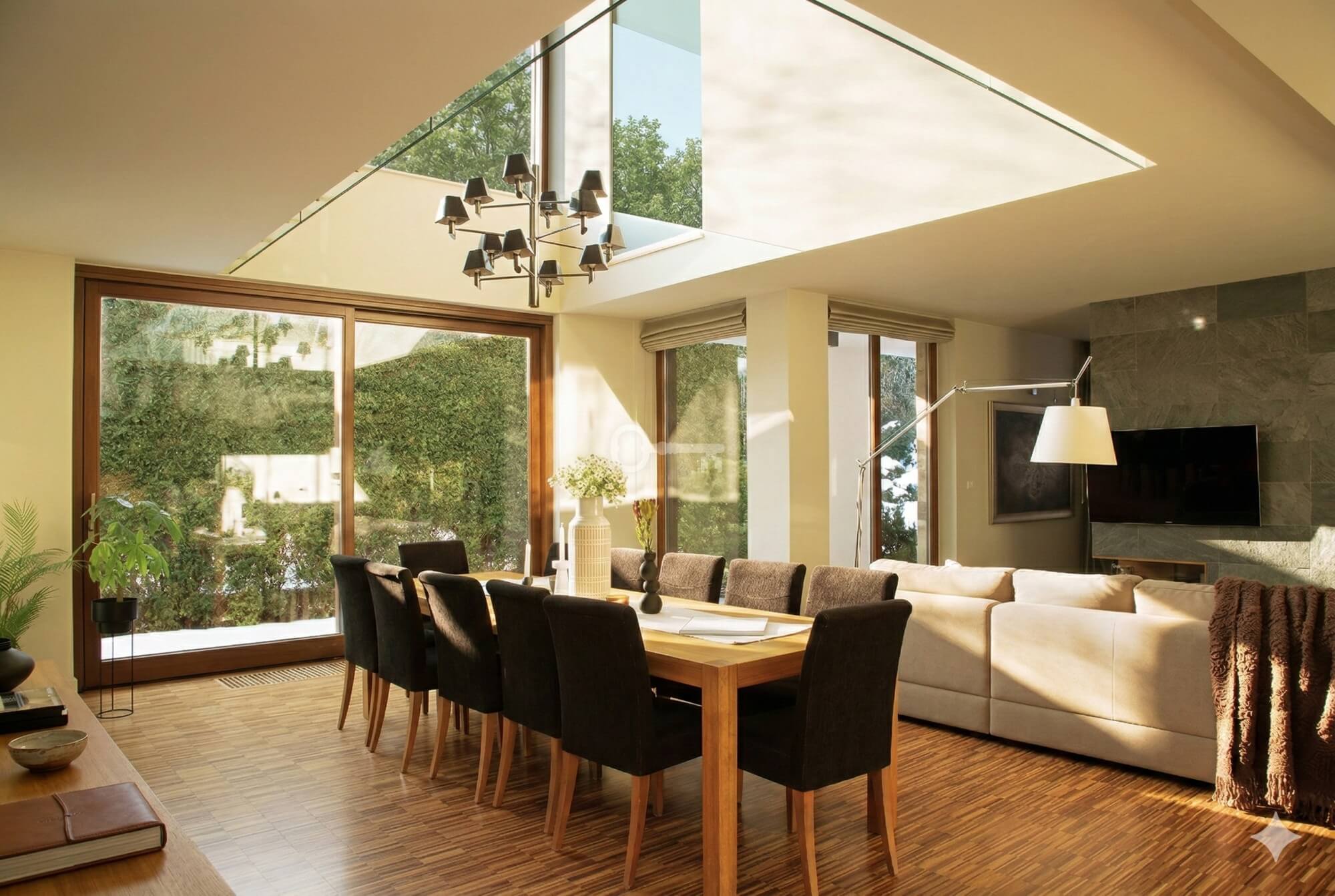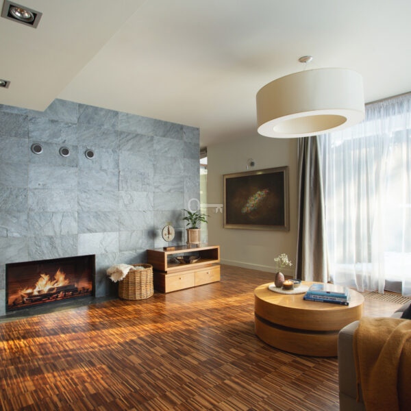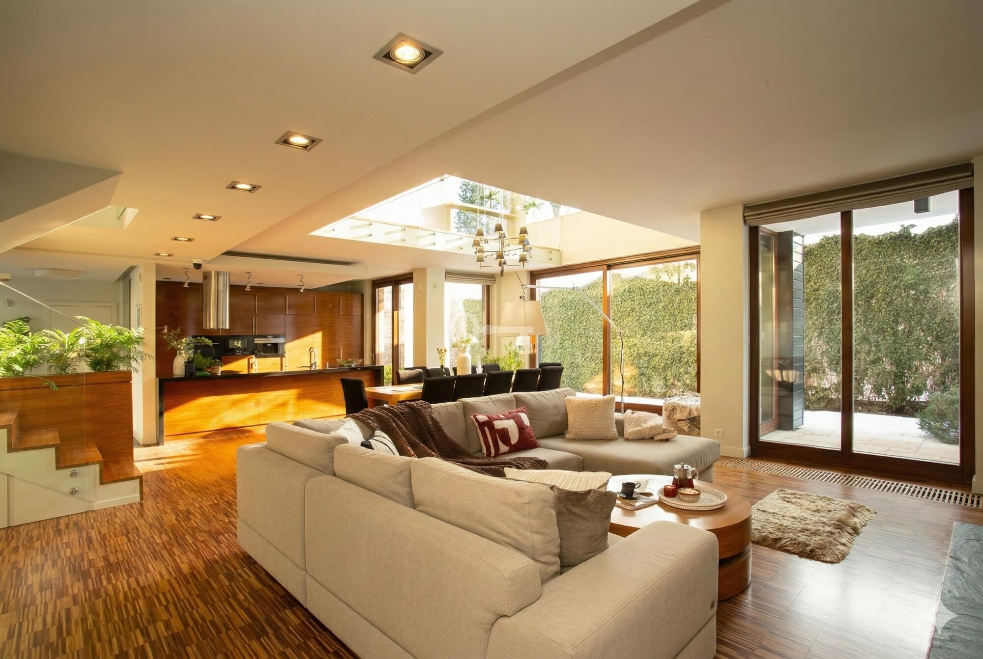 Wyobraź sobie poranek w salonie, gdzie sufit sięga 7 metrów wysokości. To nie jest pokój dzienny – to Twoja prywatna katedra światła. Przeszklone ściany zacierają granicę między luksusowym wnętrzem a ogrodem, a kominek wieczorami staje się sercem domu, wokół którego buduje się najpiękniejsze wspomnienia.