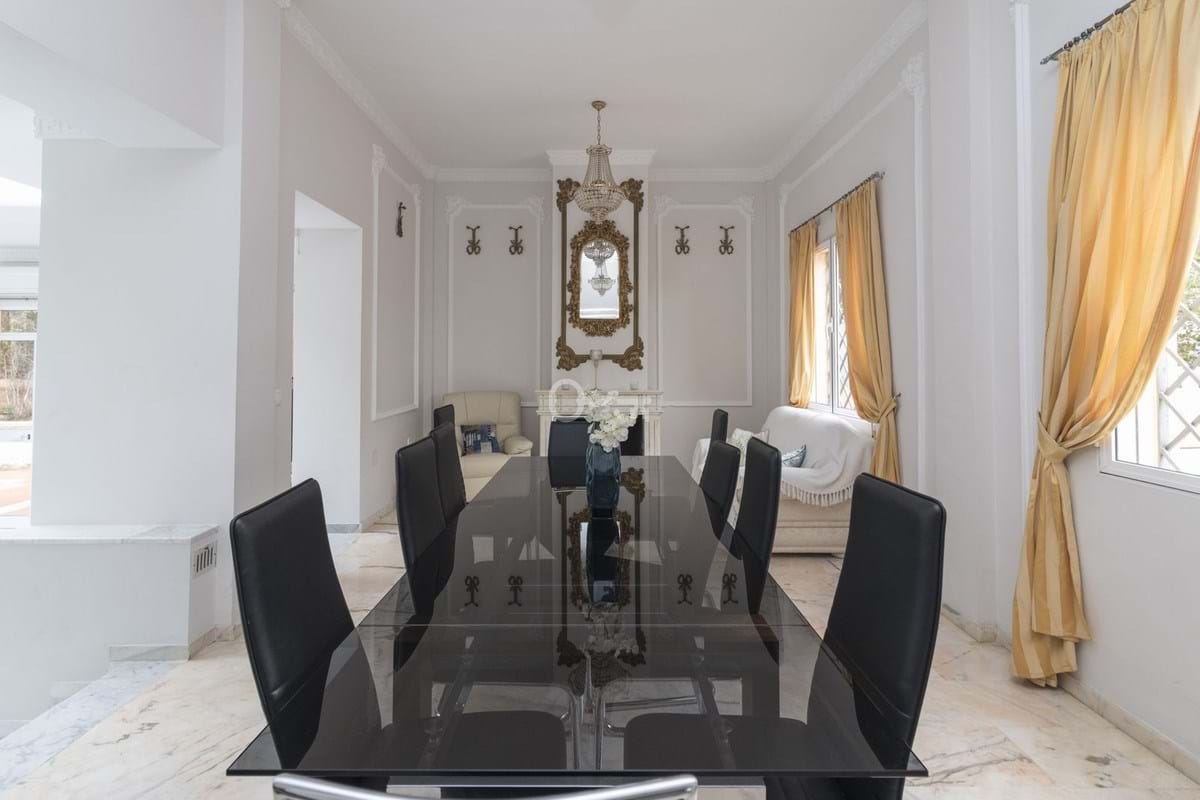Upon entering the house we find a hall, two large living rooms, one a dining room and the other a luxurious living room with a fireplace and marble columns.