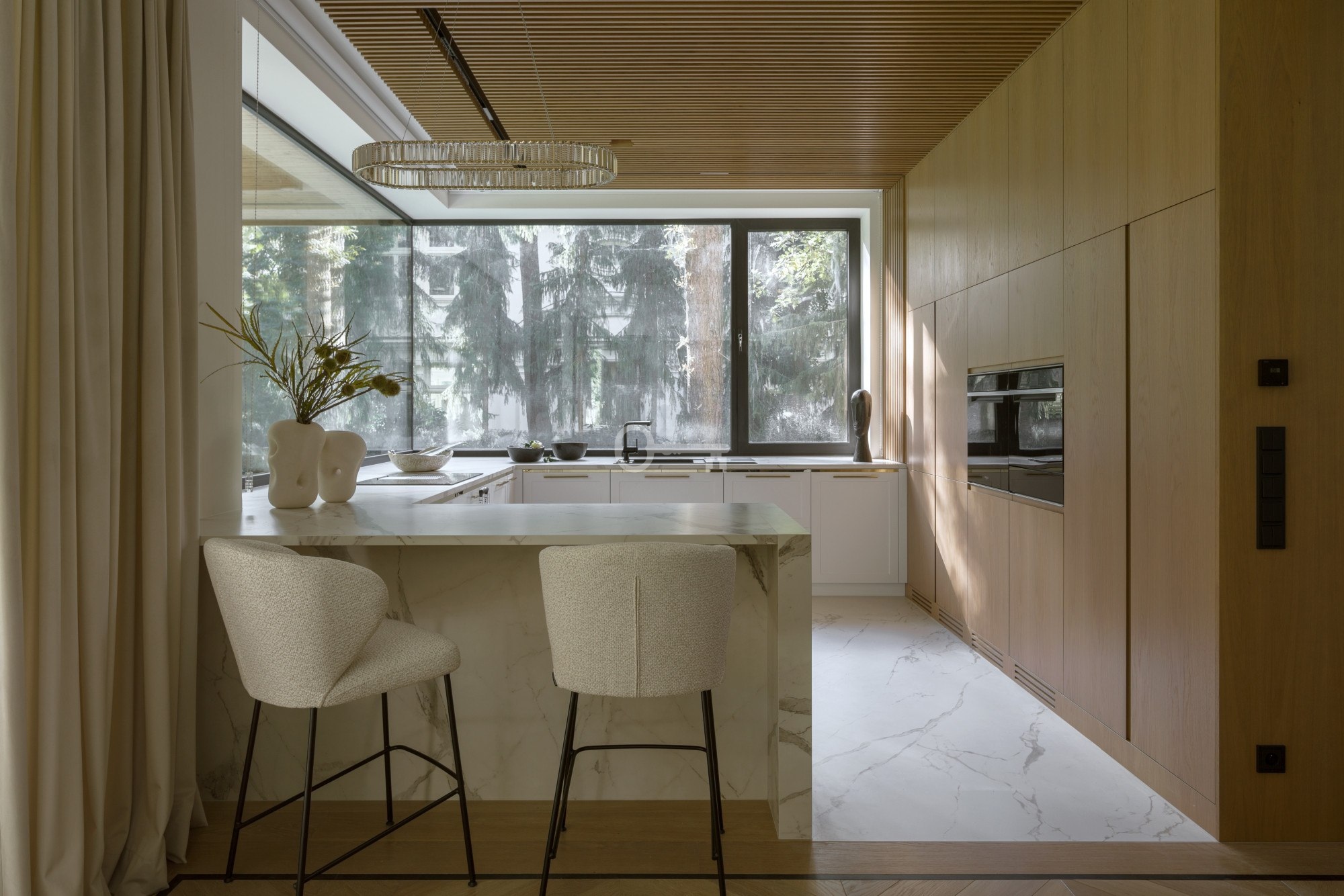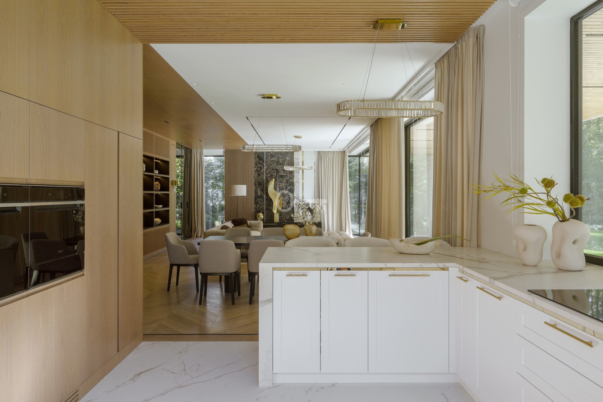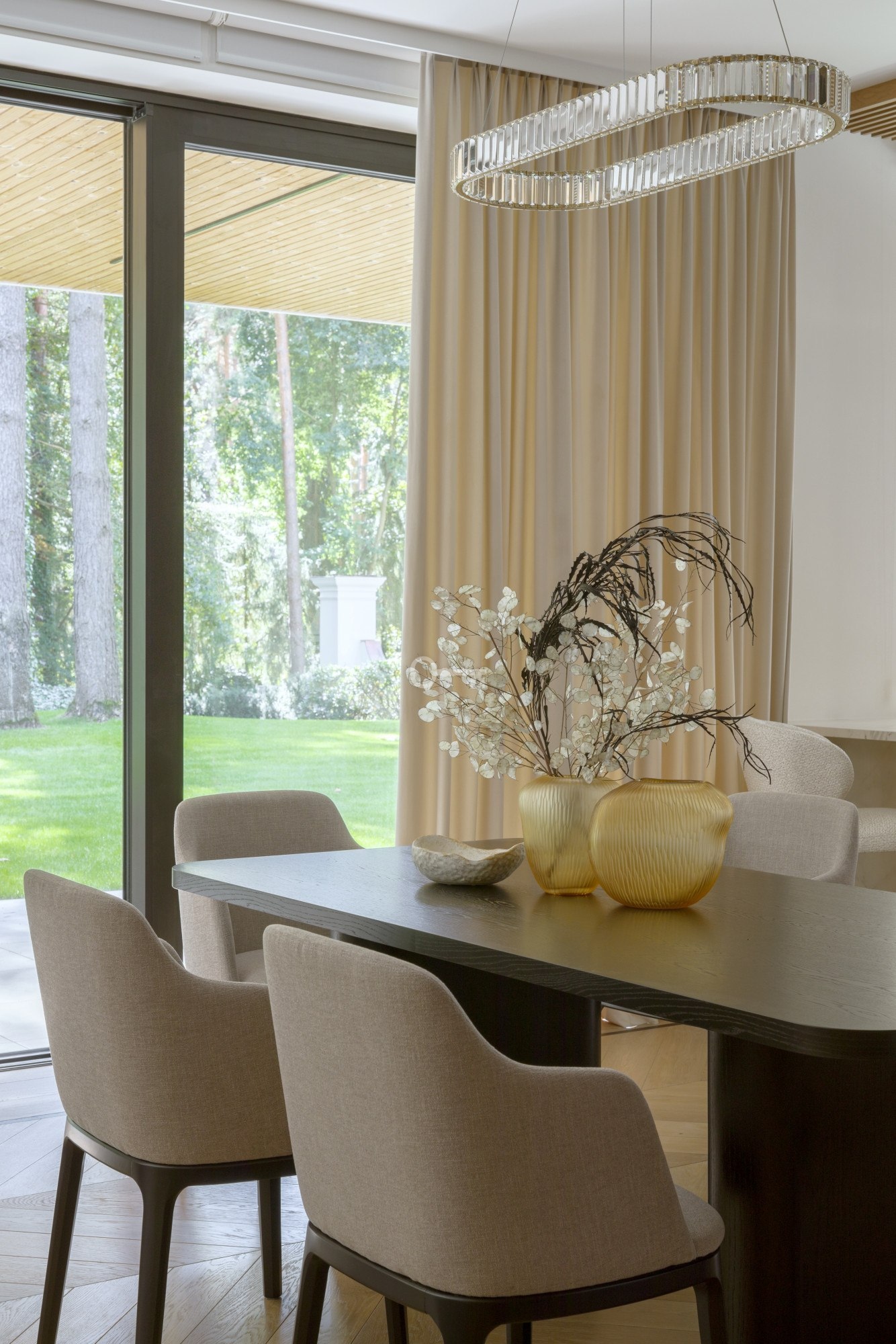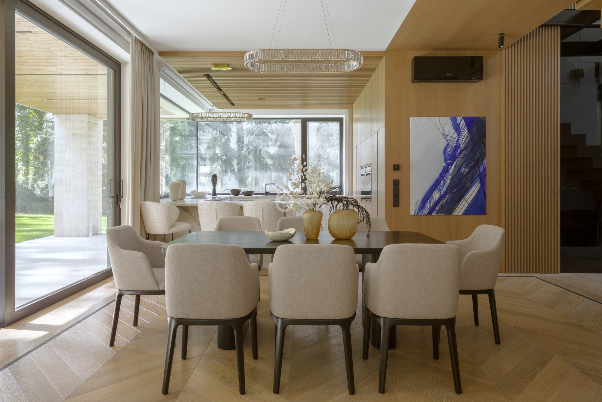The ground floor of the house creates an open and functional space. The focal point is a bright, open, south-west facing living room, where natural light freely penetrates through large windows, emphasizing the elegance of the combination of the relaxation area with a modern kitchenette and a dining area with a large table.