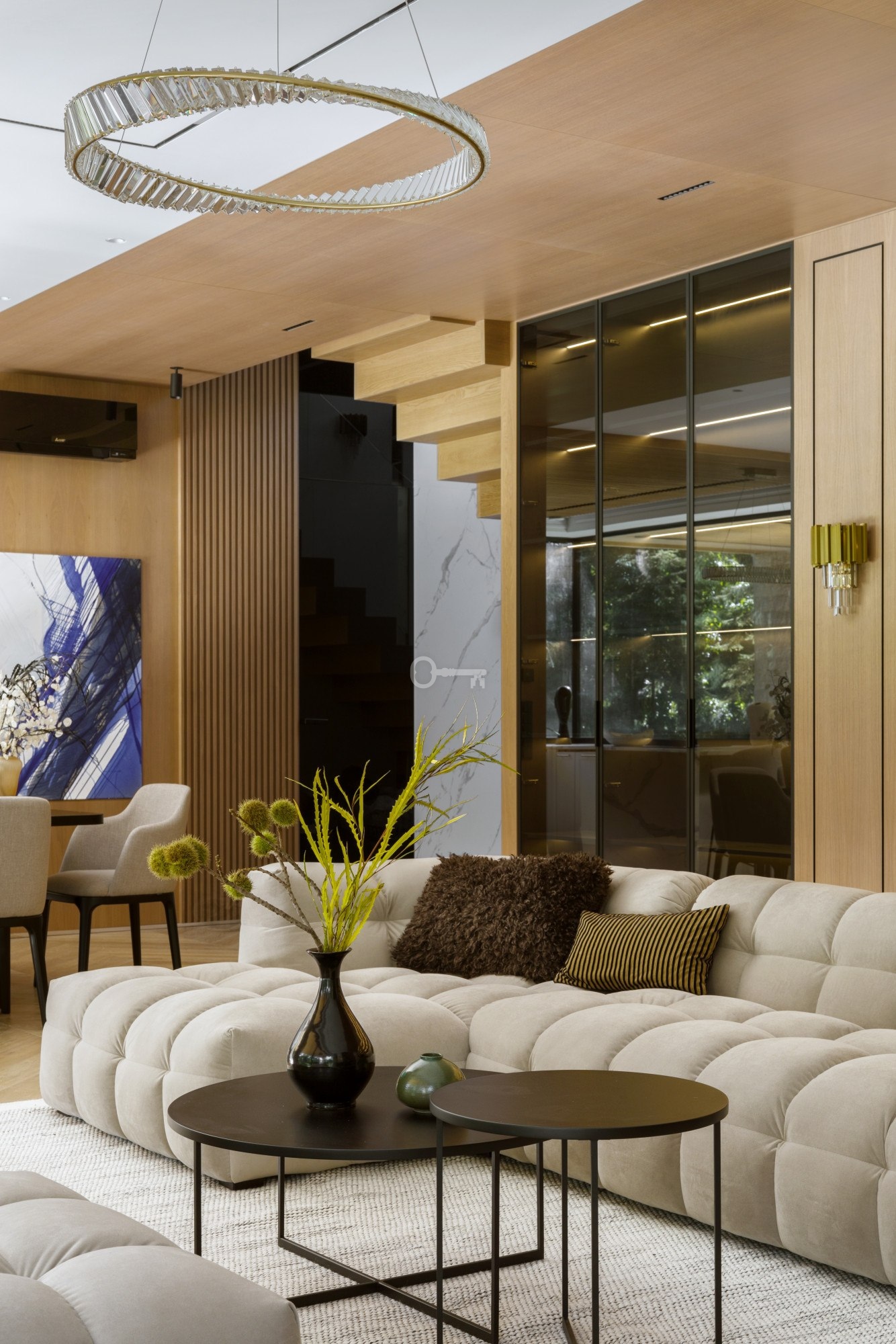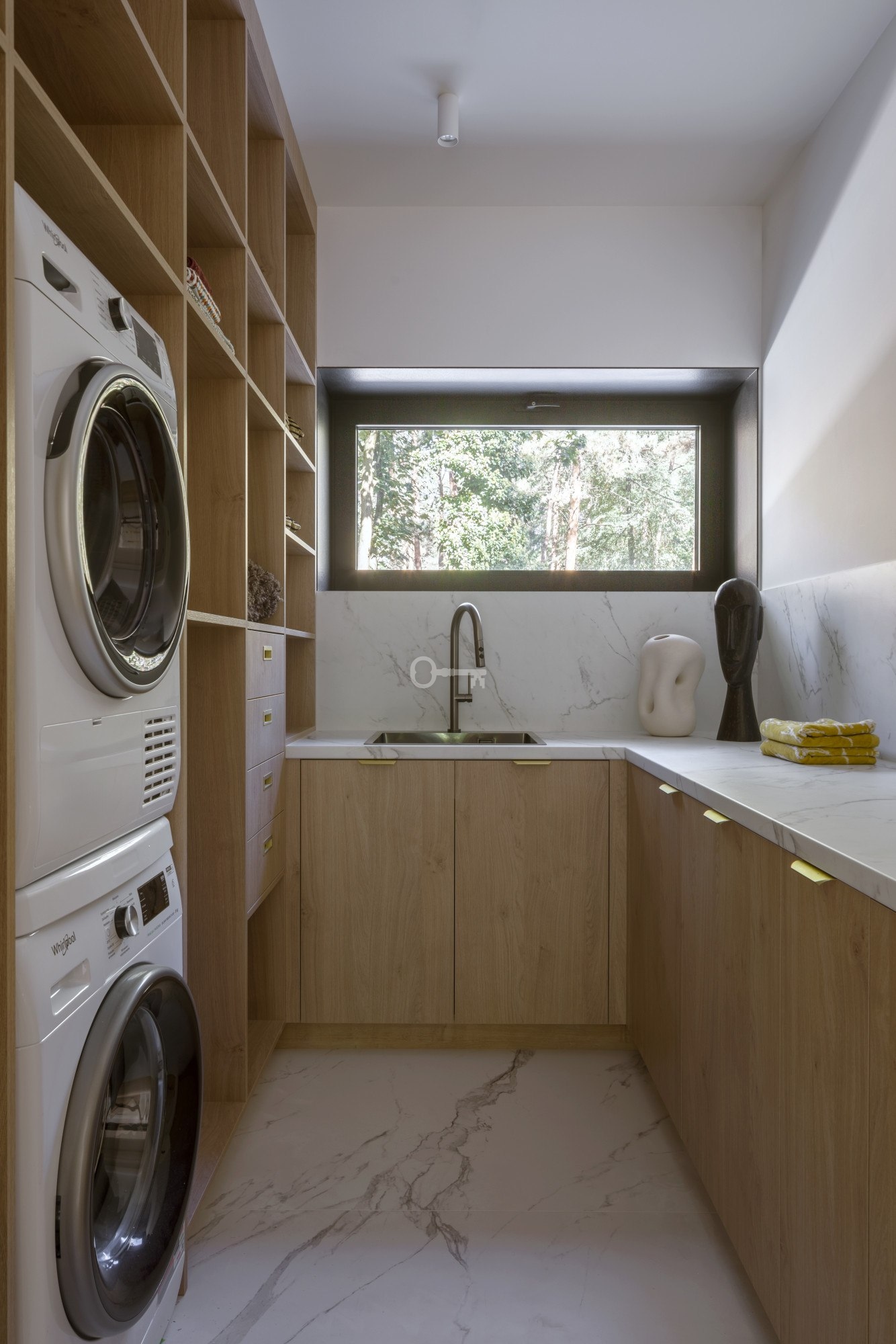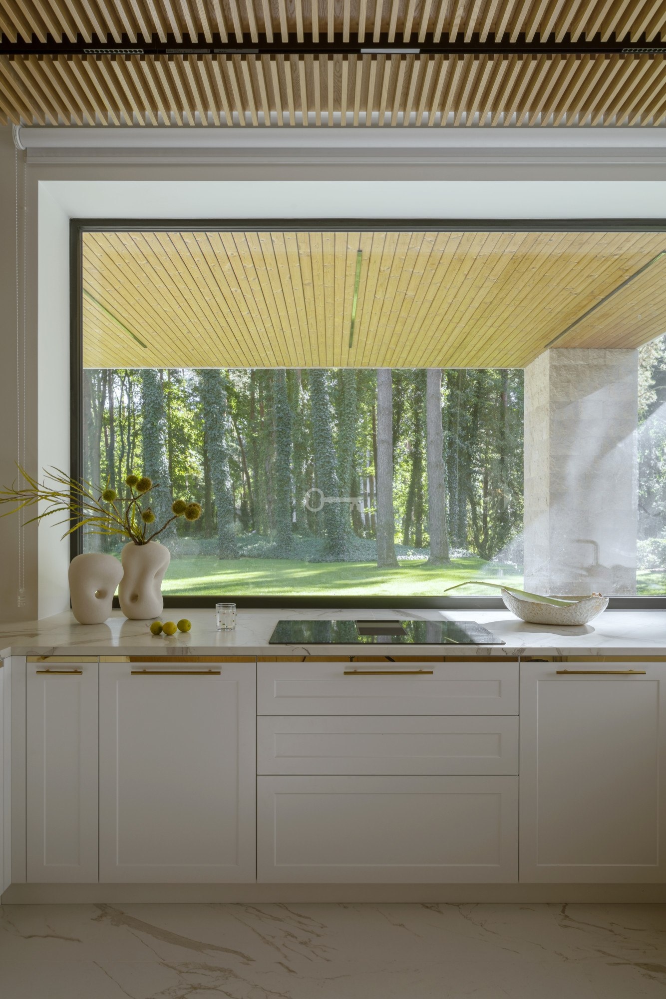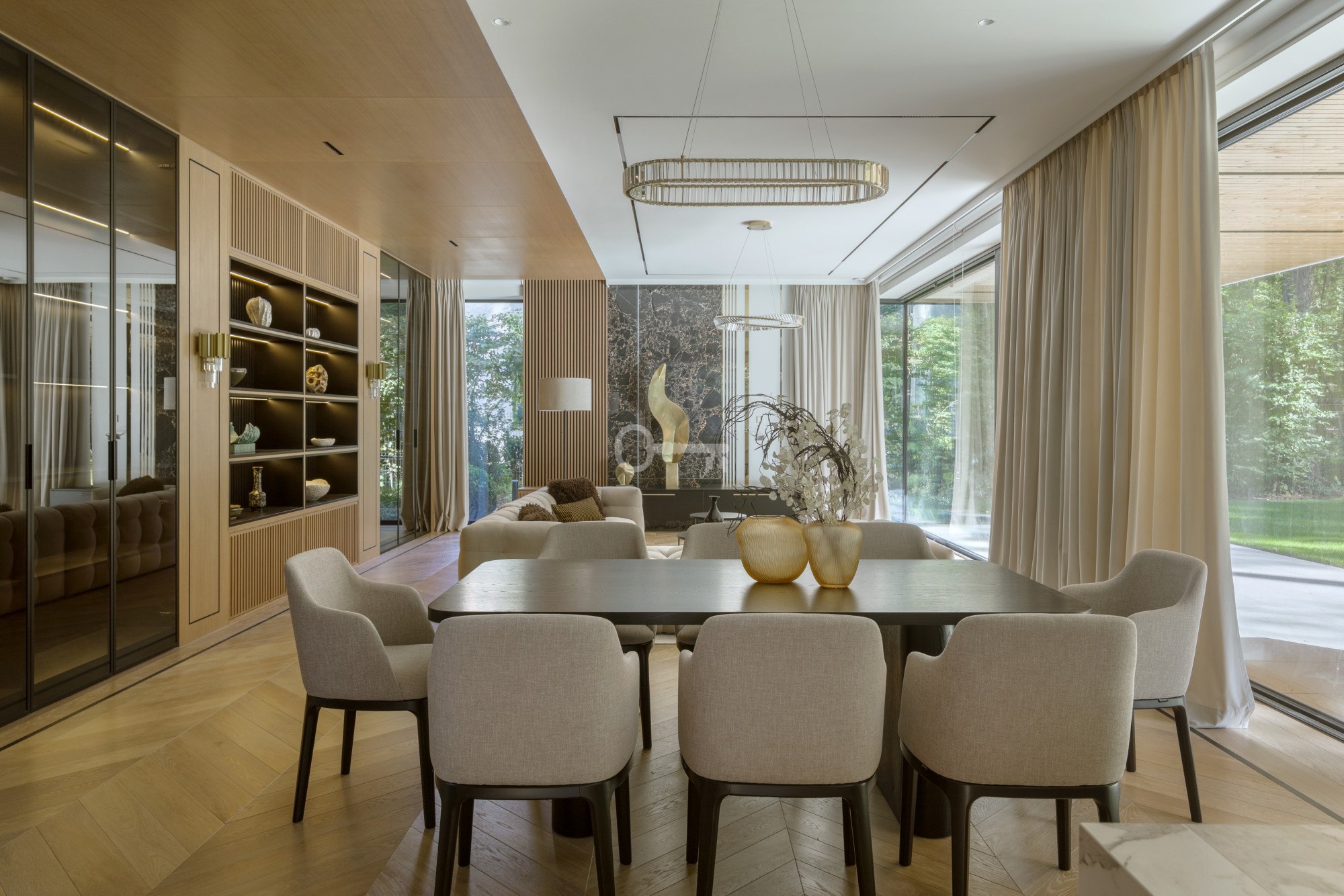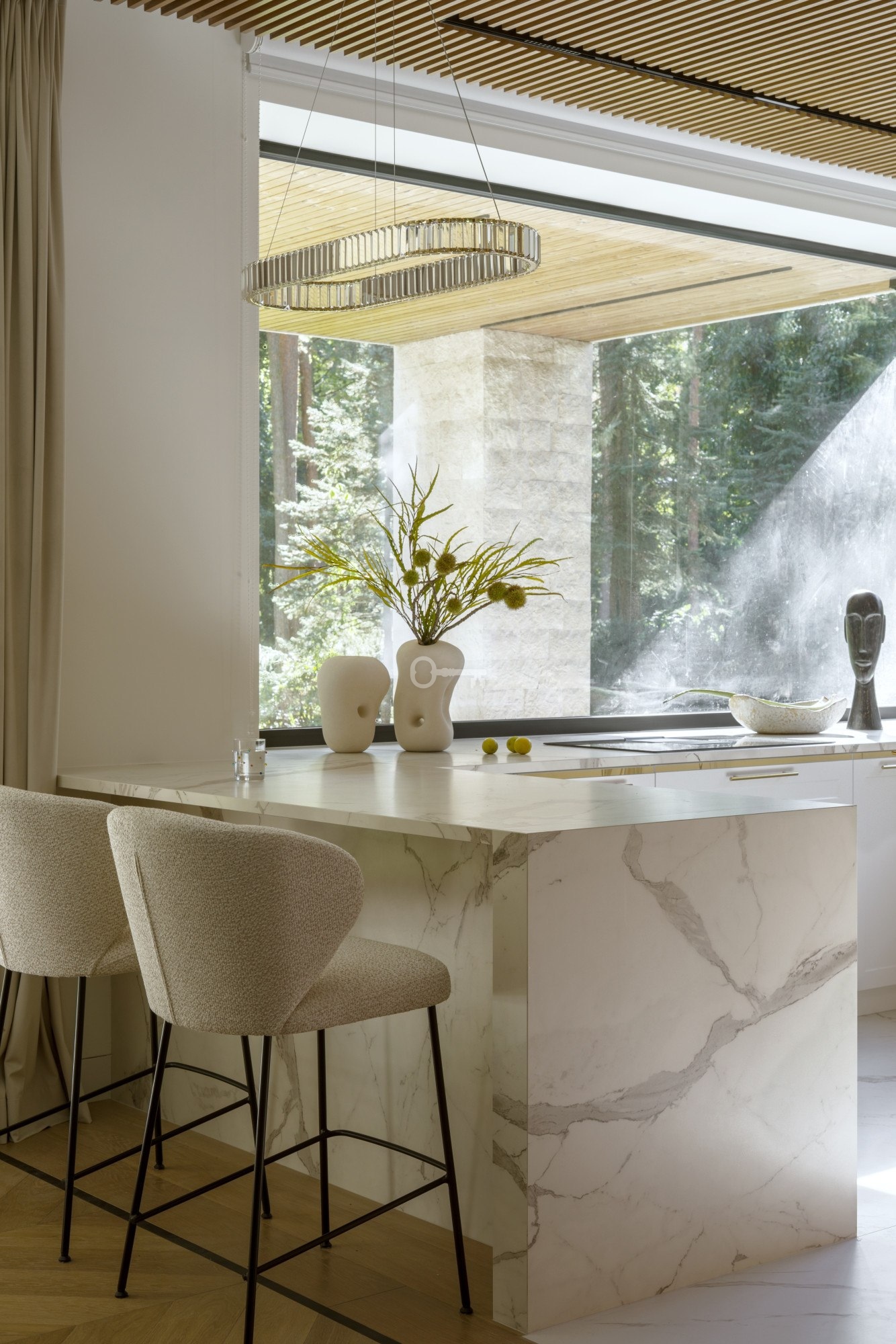 The ground floor of the house creates an open and functional space. The focal point is a bright, open, south-west facing living room, where natural light freely penetrates through large windows, emphasizing the elegance of the combination of the relaxation area with a modern kitchenette and a dining area with a large table.