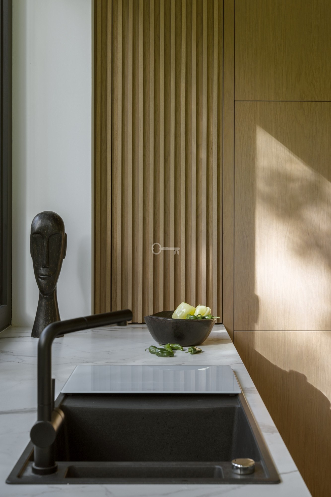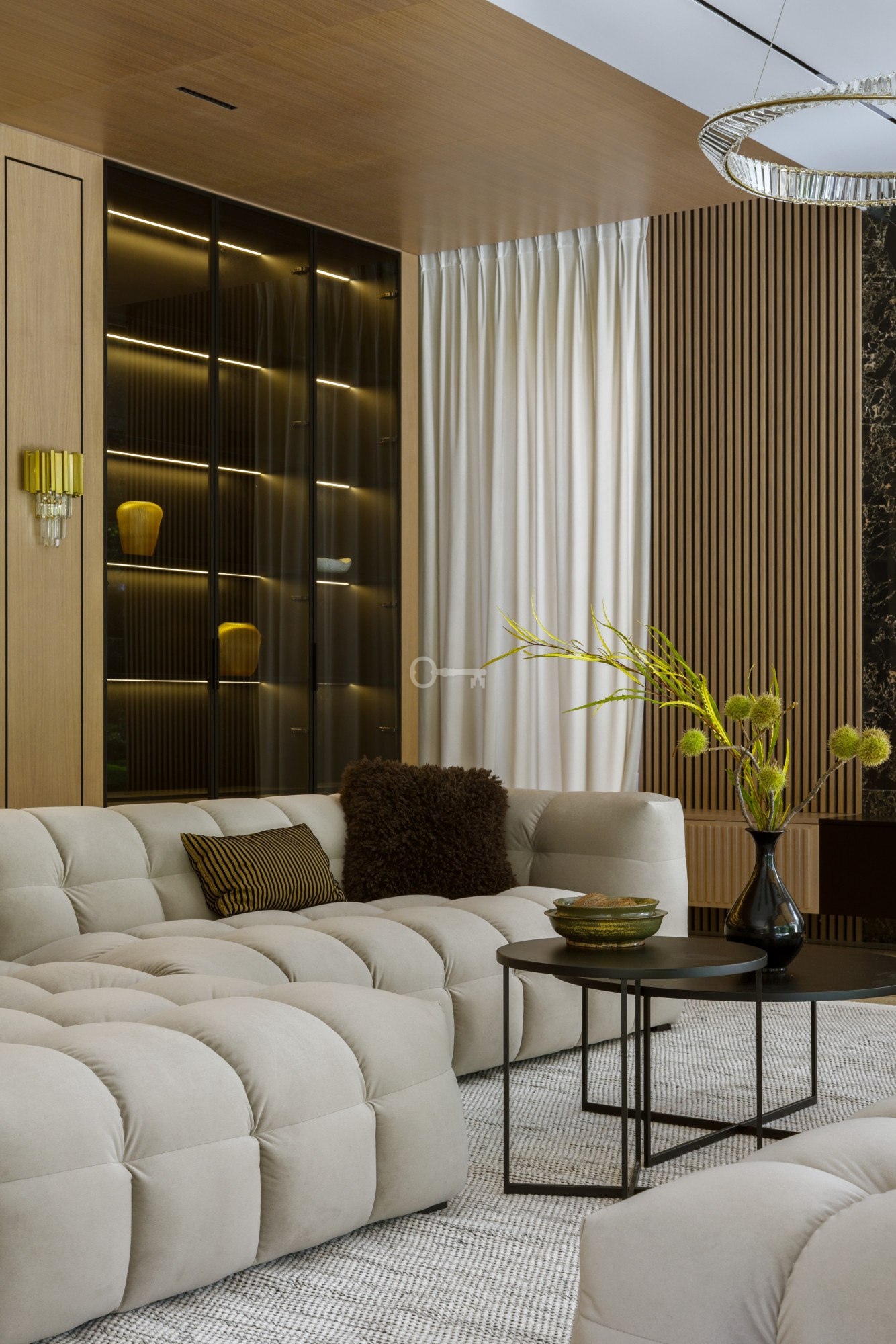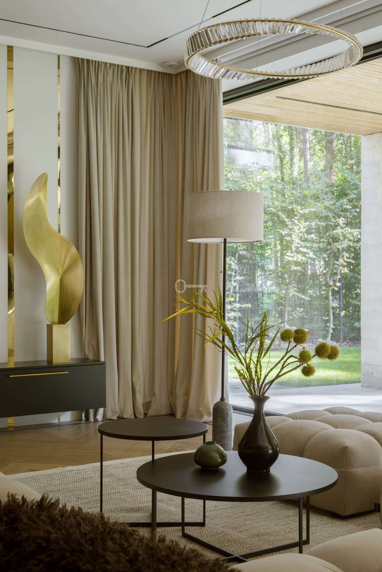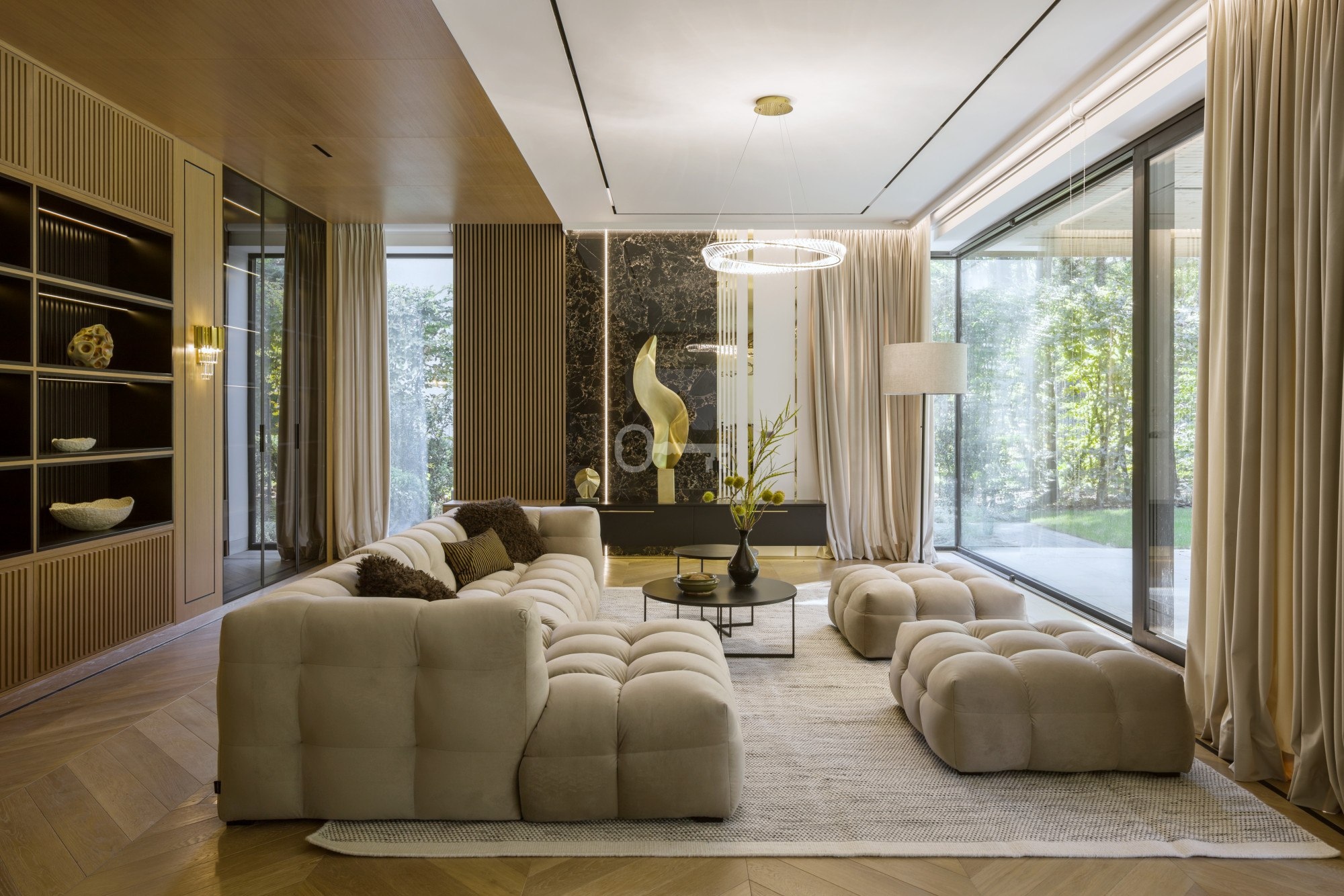The ground floor of the house creates an open and functional space. The focal point is a bright, open, south-west facing living room, where natural light freely penetrates through large windows, emphasizing the elegance of the combination of the relaxation area with a modern kitchenette and a dining area with a large table.