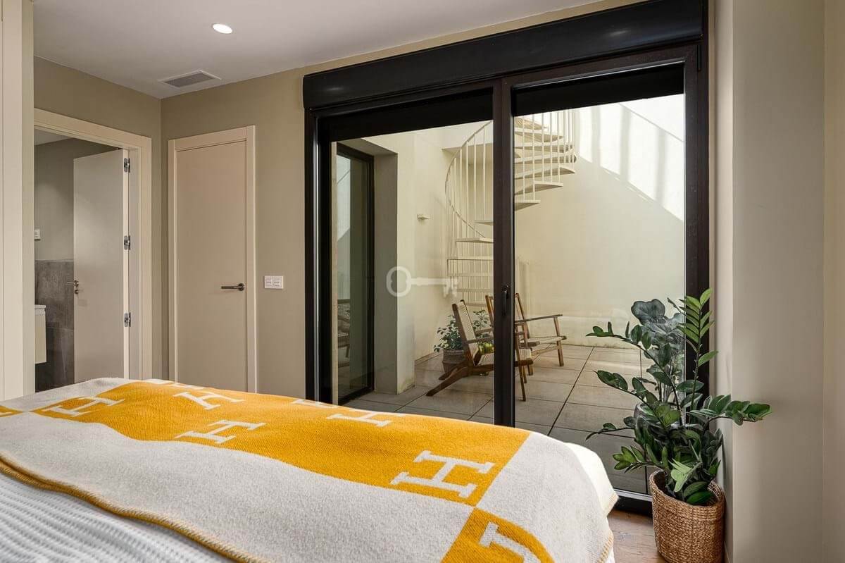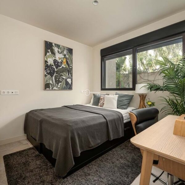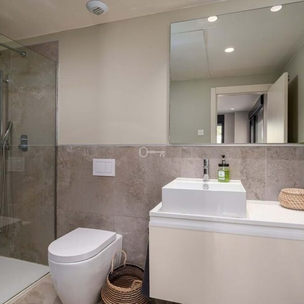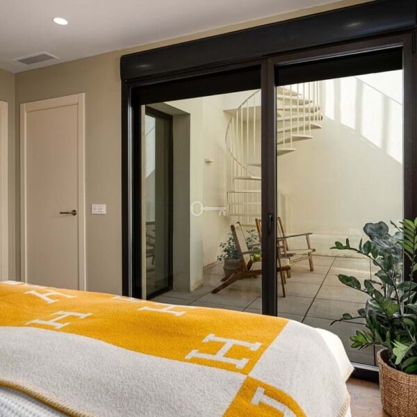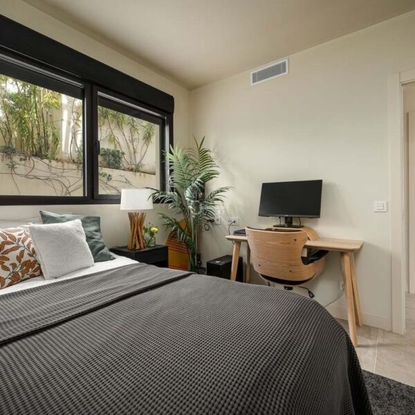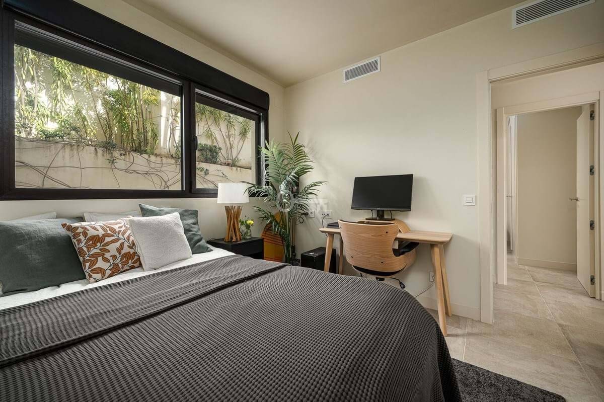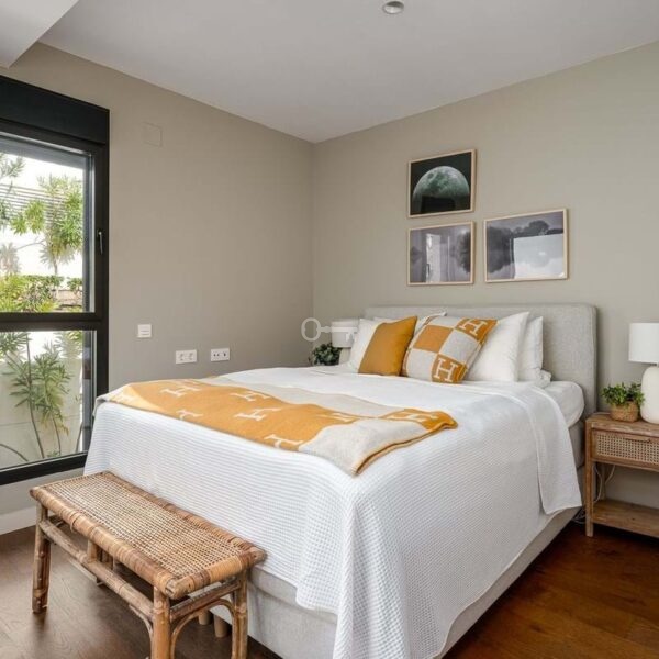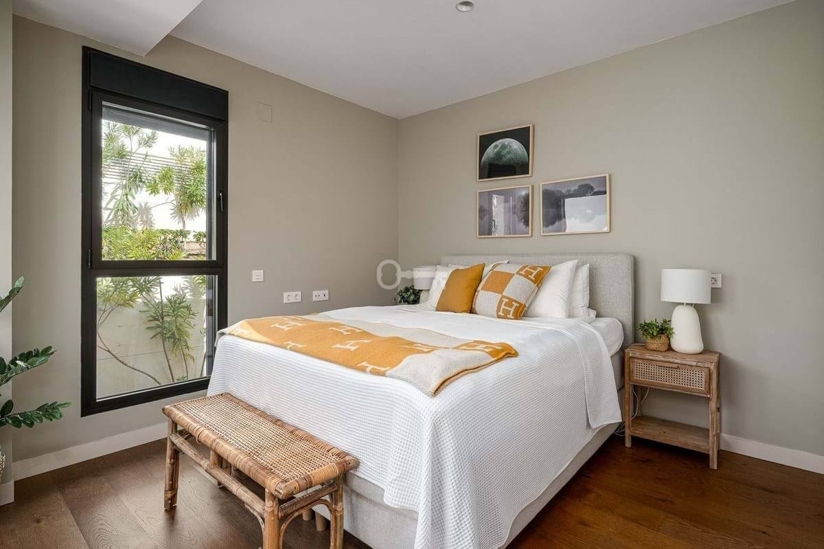 The master bedroom is a sanctuary of calm and refinement featuring a walk-in closet, a luxurious en-suite bathroom with double vanity, bathtub and walk-in shower, and direct access to a private terrace designed for serene mornings under the Spanish sun.