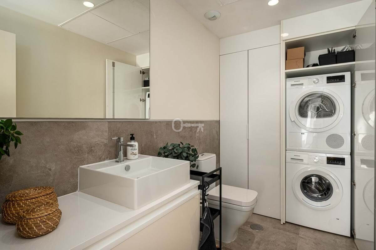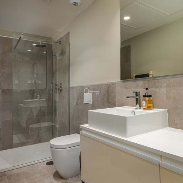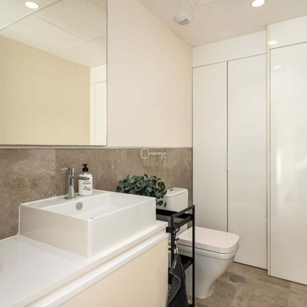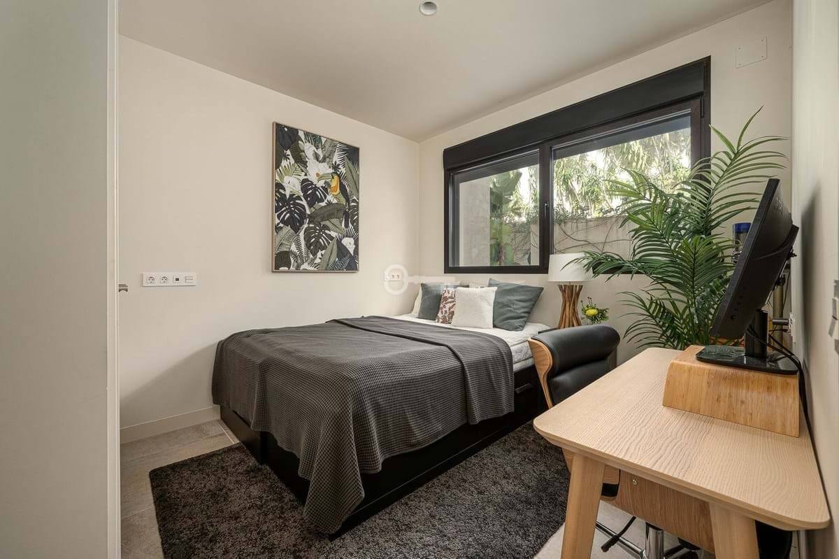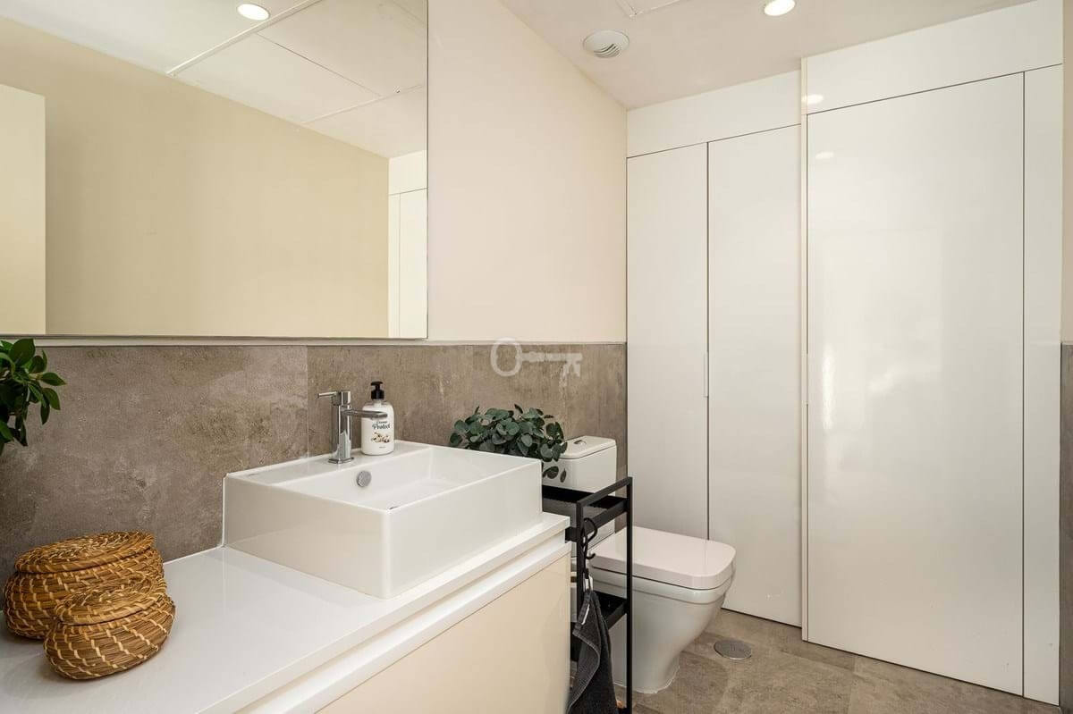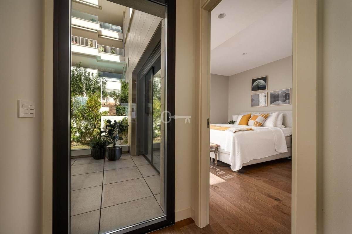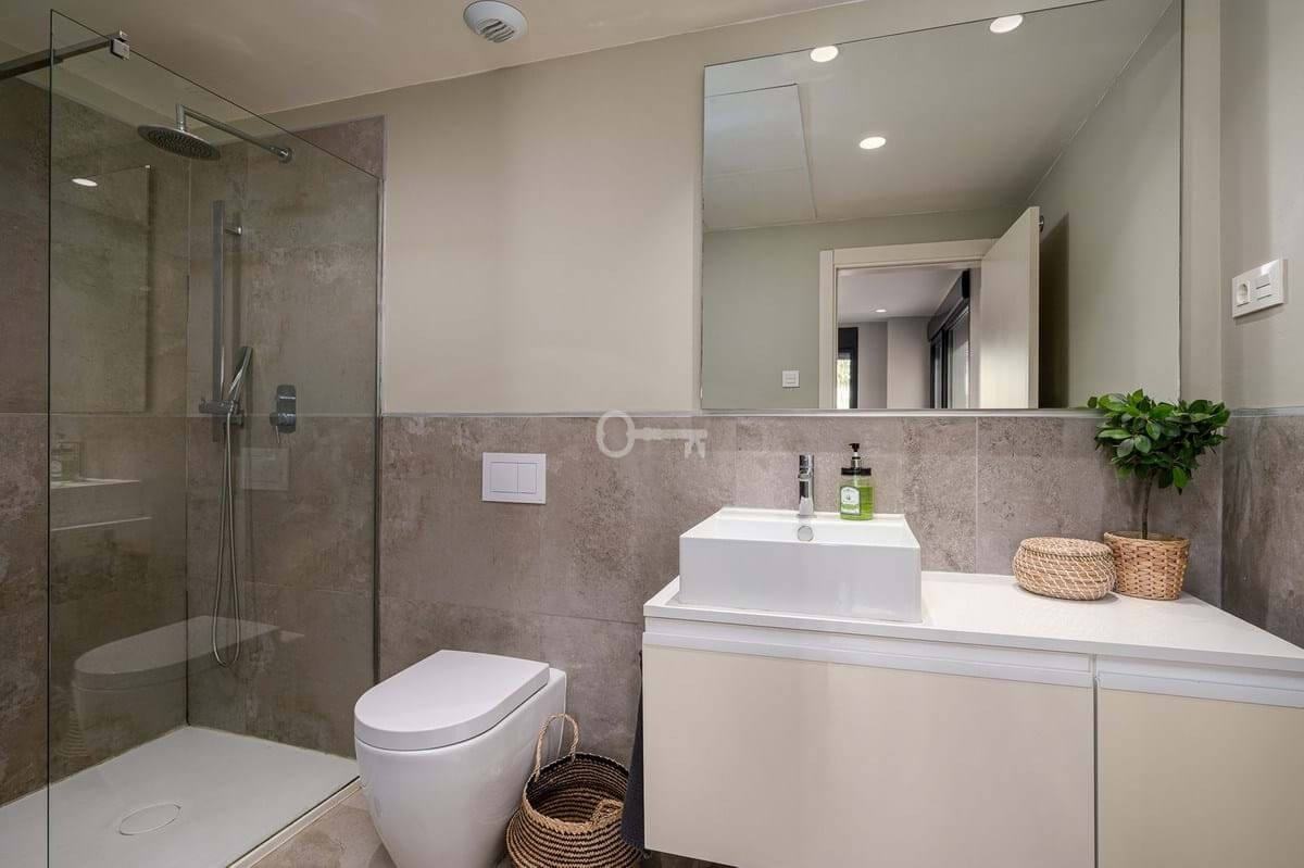 The master bedroom is a sanctuary of calm and refinement featuring a walk-in closet, a luxurious en-suite bathroom with double vanity, bathtub and walk-in shower, and direct access to a private terrace designed for serene mornings under the Spanish sun.