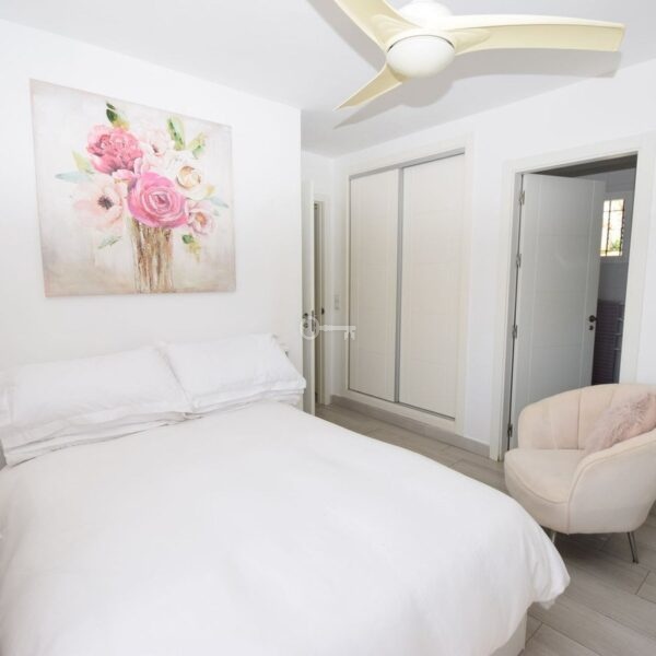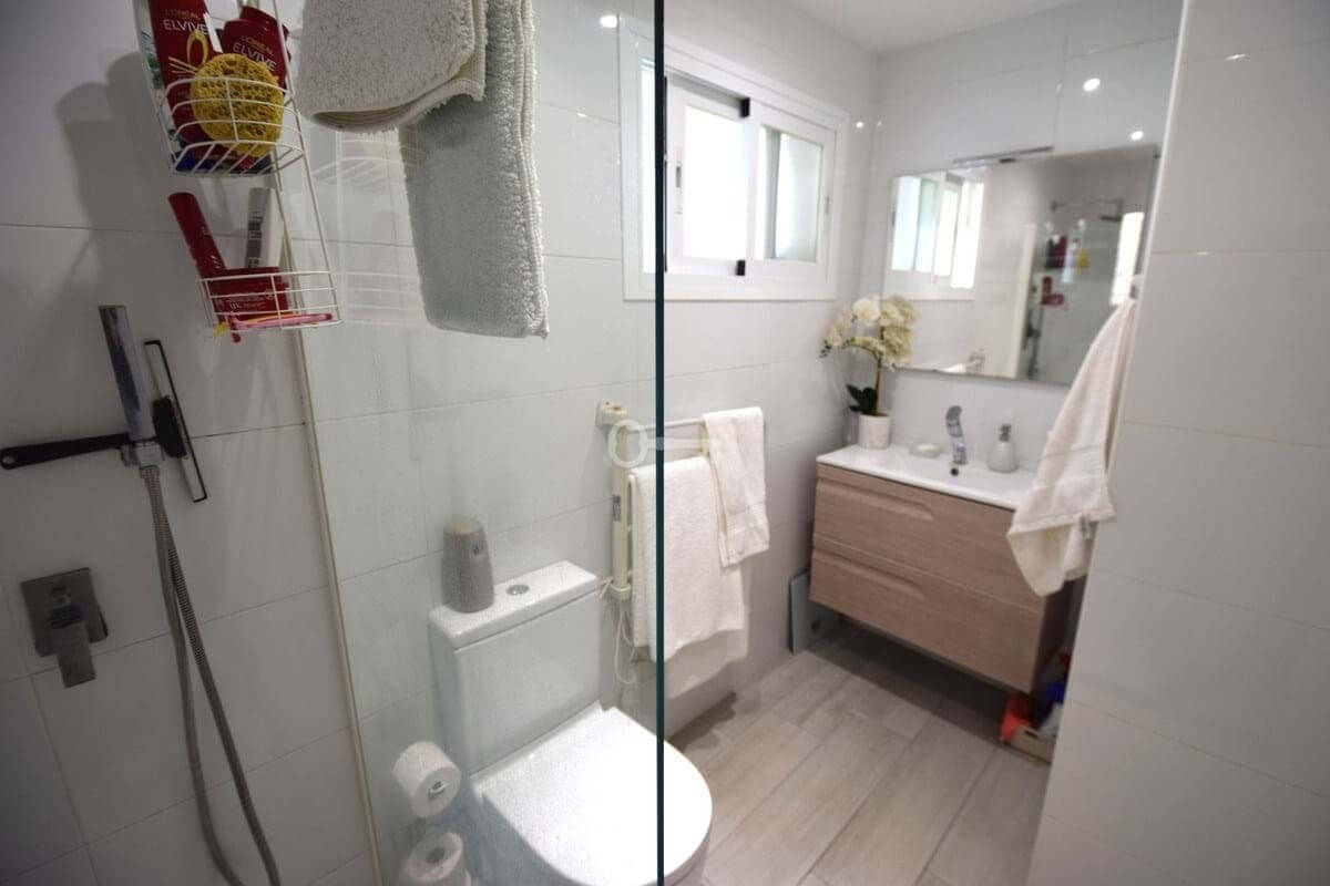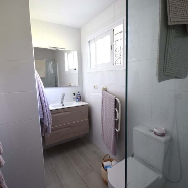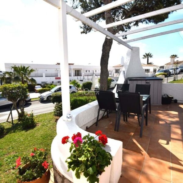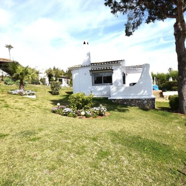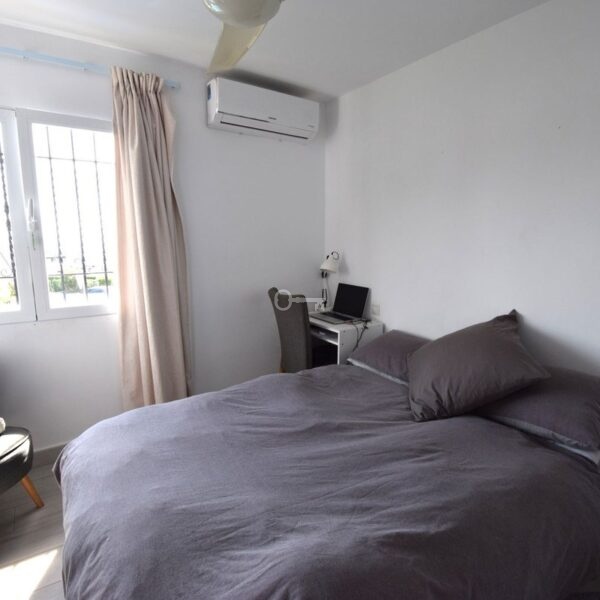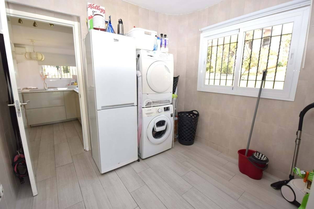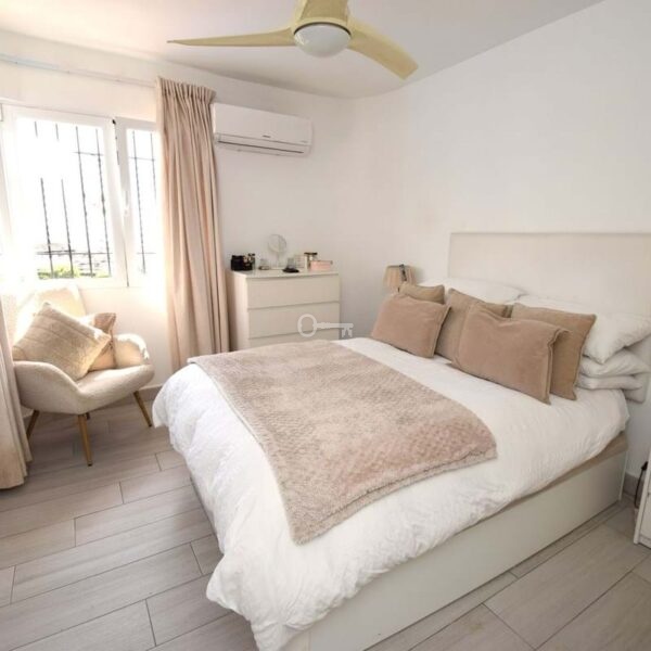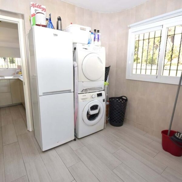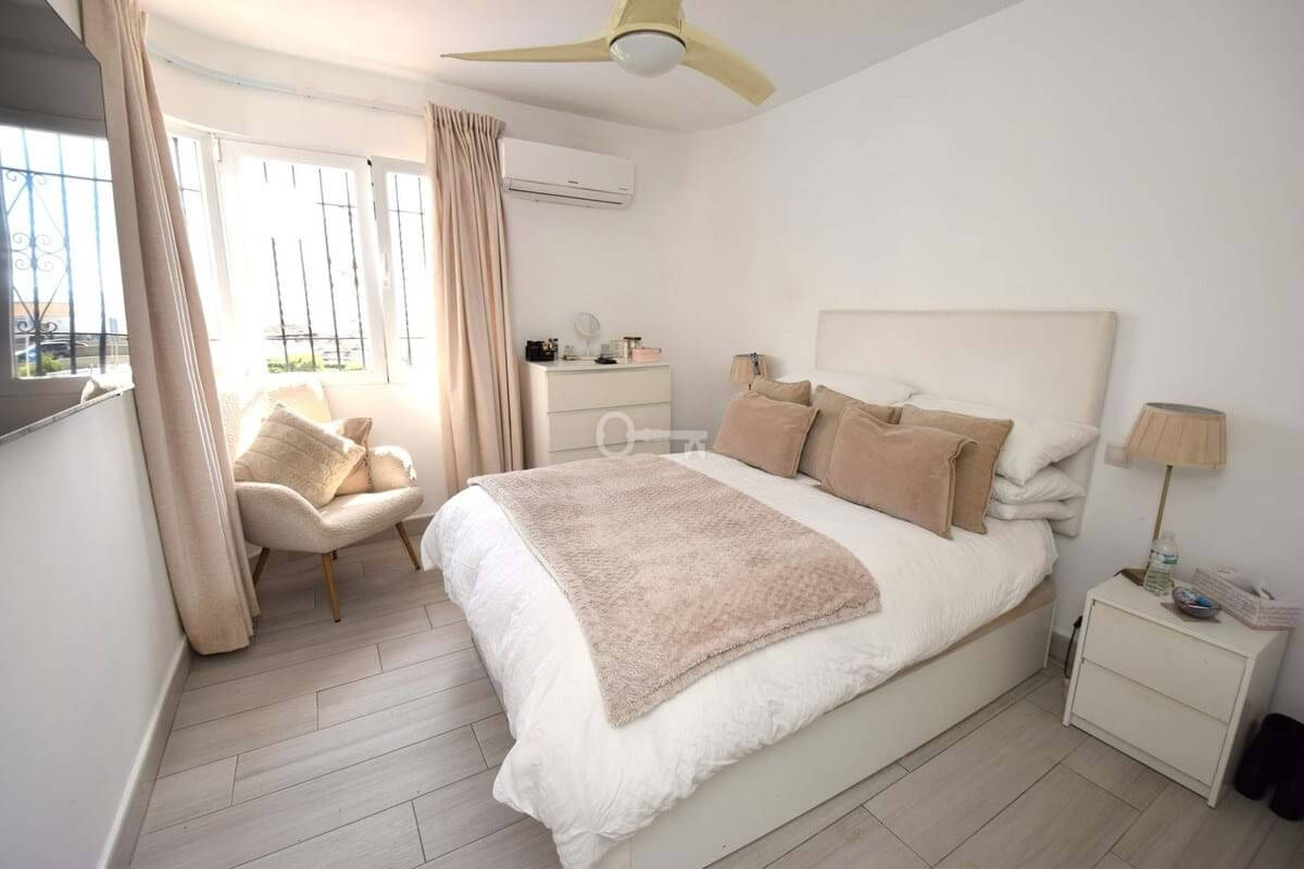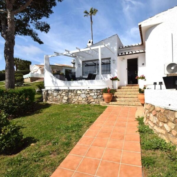 Rarely available single level villa, perfect as a holiday home or a permanent residence. Located in one of the first communities built around La Cala, currently with no restrictions on short term holiday rentals. The property was completely renovated by the present owners in 2016 and is distributed as follows; entrance hall with TV lounge and fireplace on your left as you enter the property. In front of you is the welcoming dining area and to the right you have the fully fitted open plan kitchen. An abundance of natural light flood this area thanks to the large, modern windows and behind the kitchen you have the spacious utility room with washing machine, dryer and access to the rear drying terrace and garden. In front of the kitchen you have the hallway that leads to all three double bedrooms, each with individual hot and cold air conditioning, the master bedroom with an ensuite shower room and the second shower room services both guest bedrooms. The villa is located in a fenced, corner plot which is mostly laid to lawn with a variety of flowers, hedge rows and bushes throughout the garden. The communal swimming pool and children’s pool are just a couple of minutes walk away in the centre of the community and, like the villa itself, benefit from all day sun.