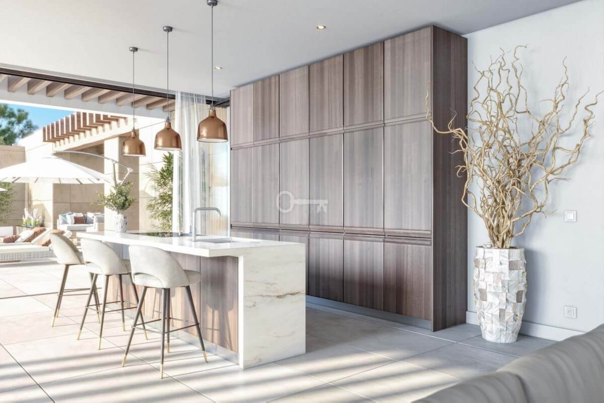 The living areas flow out onto spacious covered terraces, relaxation areas and a carefully designed garden, where the private swimming pool serves as the focal point for enjoying the Mediterranean climate all year round, whether for moments of relaxation or for entertaining guests.
