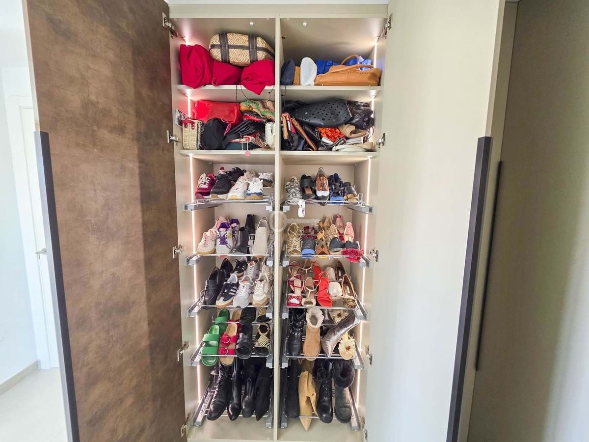 The living-dining room connects with an open-plan kitchen that has been fully renovated recently, equipped with high-end Neff appliances, ensuring a modern, functional, and elegant style. Additional improvements include built-in wardrobes with lighting and a glazed terrace, allowing enjoyment of the outdoor space throughout the year.