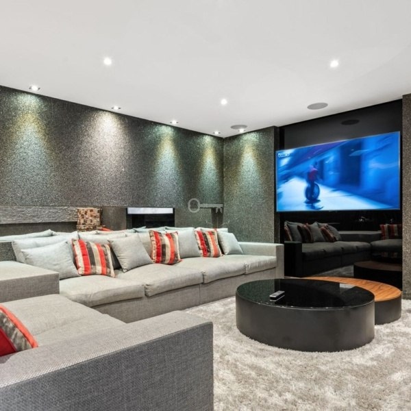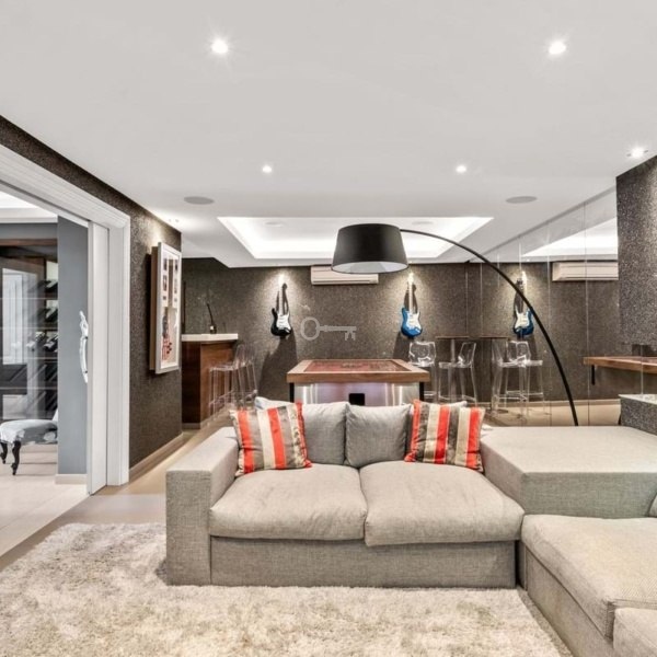 The property features underfloor heating and full air conditioning, making it suitable for both holiday living and permanent residence. Each bedroom has its own en-suite bathroom, and there is also a gym with a sauna for added comfort.