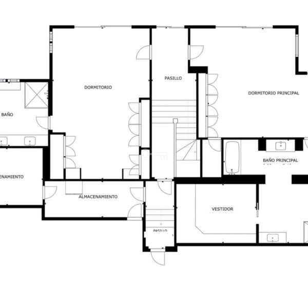 On the lower floor, there are two large bedrooms, both with en-suite bathrooms; one of them includes a generous walk-in closet. These bedrooms enjoy direct access to the garden and the pool, creating an intimate environment perfectly integrated with the outdoor areas.