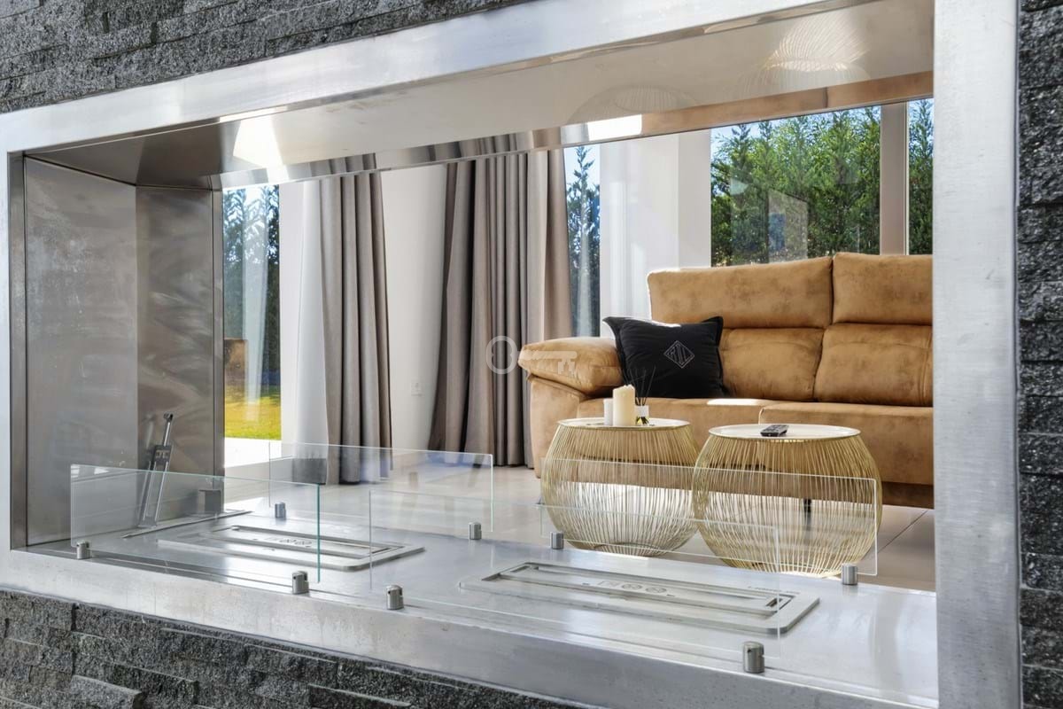 On the ground floor, the villa offers: a spacious entrance hall, a modern kitchen fully furnished and equipped with household appliances, a living room with a fireplace and a guest bedroom with an en suite bathroom and spacious terraces surrounding the entire house.