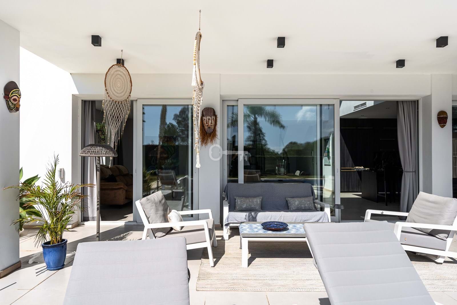 An impressive entrance hall with double-height ceilings welcomes you into the home, leading to a modern fully fitted kitchen equipped with premium appliances, a bright living area with fireplace, and a guest bedroom with an en-suite bathroom. Expansive terraces surround the entire house, seamlessly connecting indoor and outdoor living.