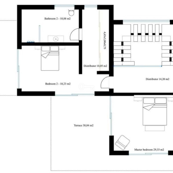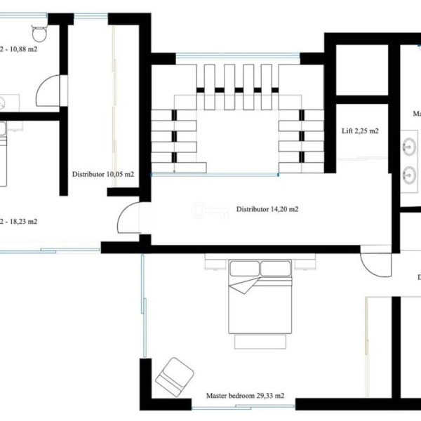 First floor: the elevator or staircase brings you to the first floor with the distributor, a double bedroom with the distributor, and a build-in wardrobe and ensuite bathroom. On the other side of the villa, you have the master bedroom with a dressing and master bedroom. Both bedrooms have access to a private terrace.
