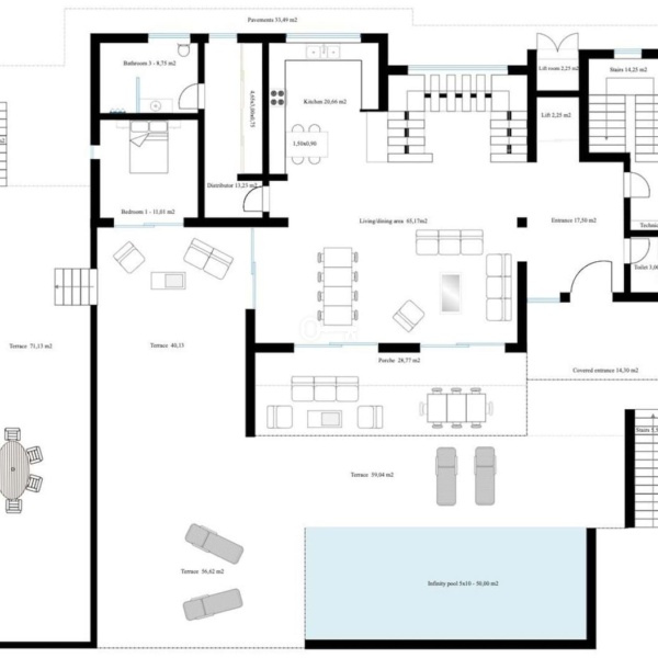 Ground floor: covered entrance, entrance, guest toilet, staircase and lift to the basement/garage, elevator room, living/dining area, staircase to the 1st floor, big open plan kitchen, distributor with build-in wardrobe, and a double bedroom with ensuite bathroom. There are plenty of covered terraces, terraces, and sitting areas with a heated infinity pool.