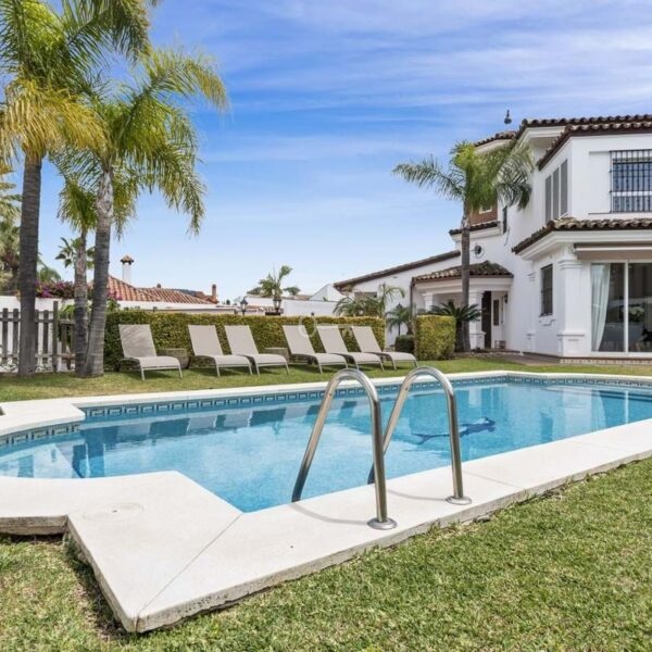 Nestled in the serene Las Chapas Playa, 300 meters from the sandy shores, awaits a stunning 5-bedroom, 6 bathroom villa. This idyllic property is conveniently situated just a 5-minute drive from Marbella Centre and a 40-minute journey from Malaga Airport, ensuring both accessibility and tranquility.
