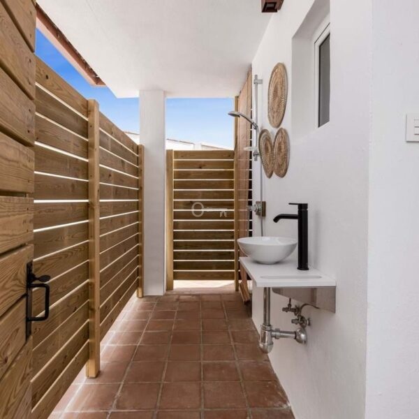 Upon entry, to the right you find the garden, showcasing a large swimming pool. To the left, an outdoor bathroom with a shower and toilet ready for post-beach refreshment.