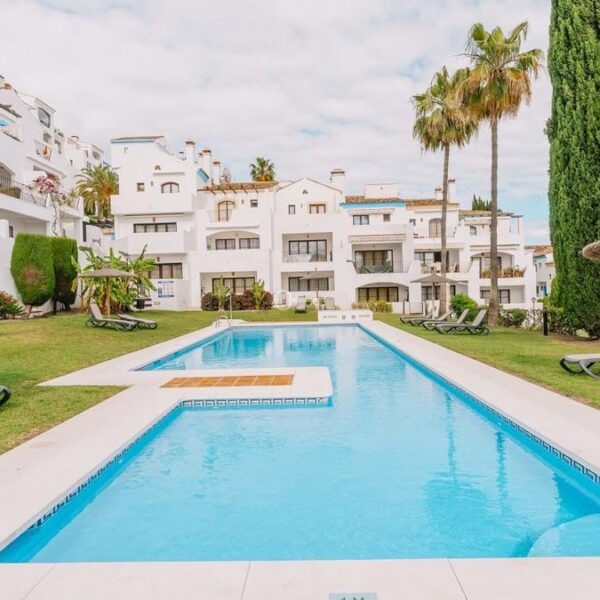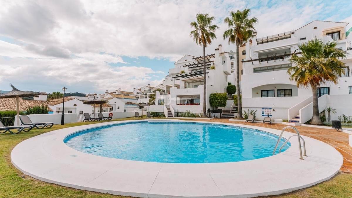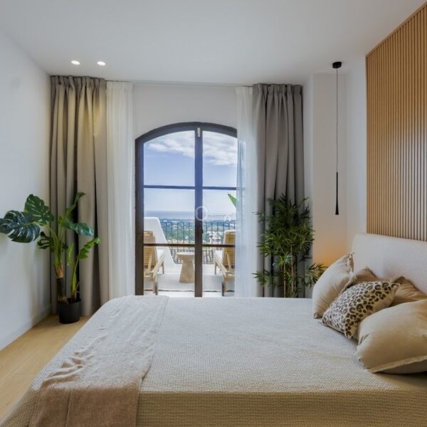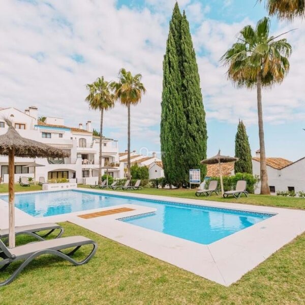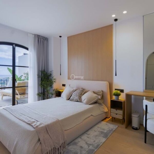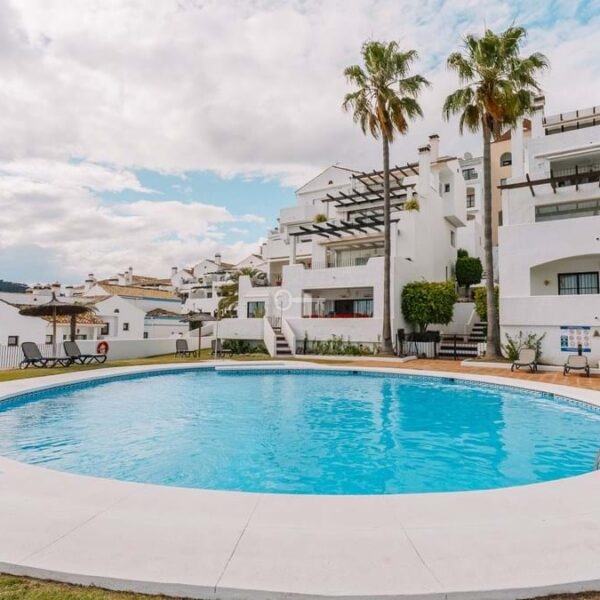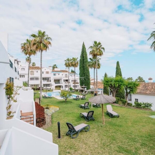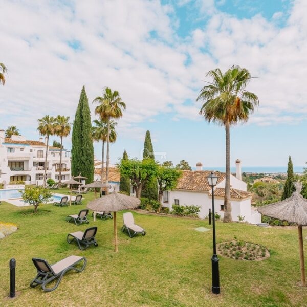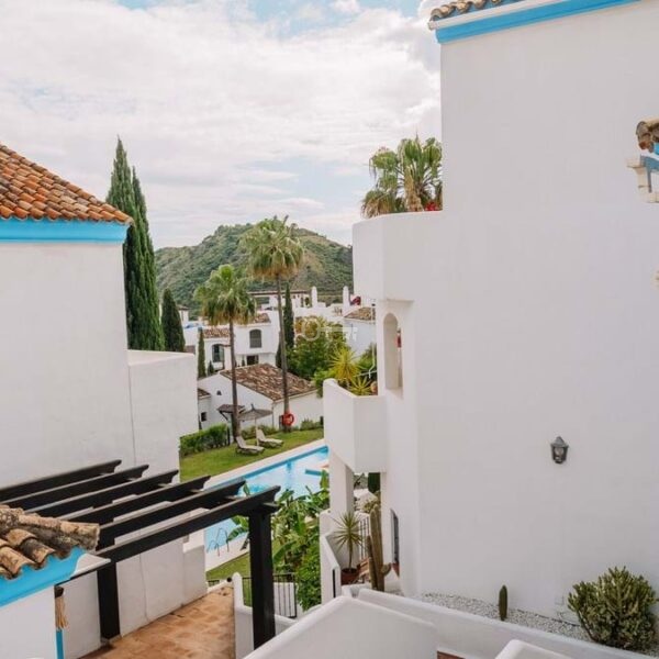 Located in El Alto within Los Arqueros, the townhouse occupies an elevated hillside position inside a gated residential urbanisation. The community is defined by landscaped gardens and two communal swimming pools, one oriented towards panoramic sea views. The property benefits from a south-facing terrace with open views across the Marbella and Estepona coastline extending towards Gibraltar, with protected surrounding land preserving the outlook. An upper terrace incorporates a private jacuzzi, reinforcing the multi-level exterior configuration.