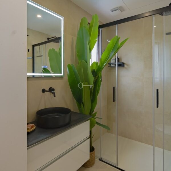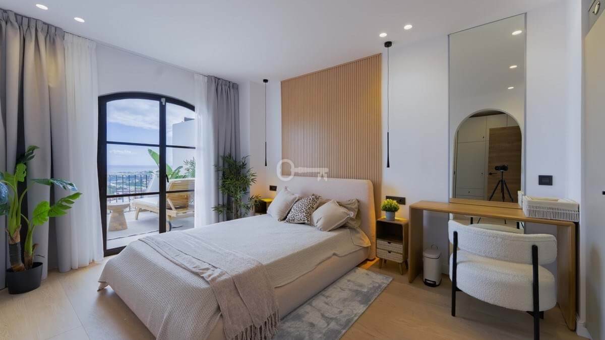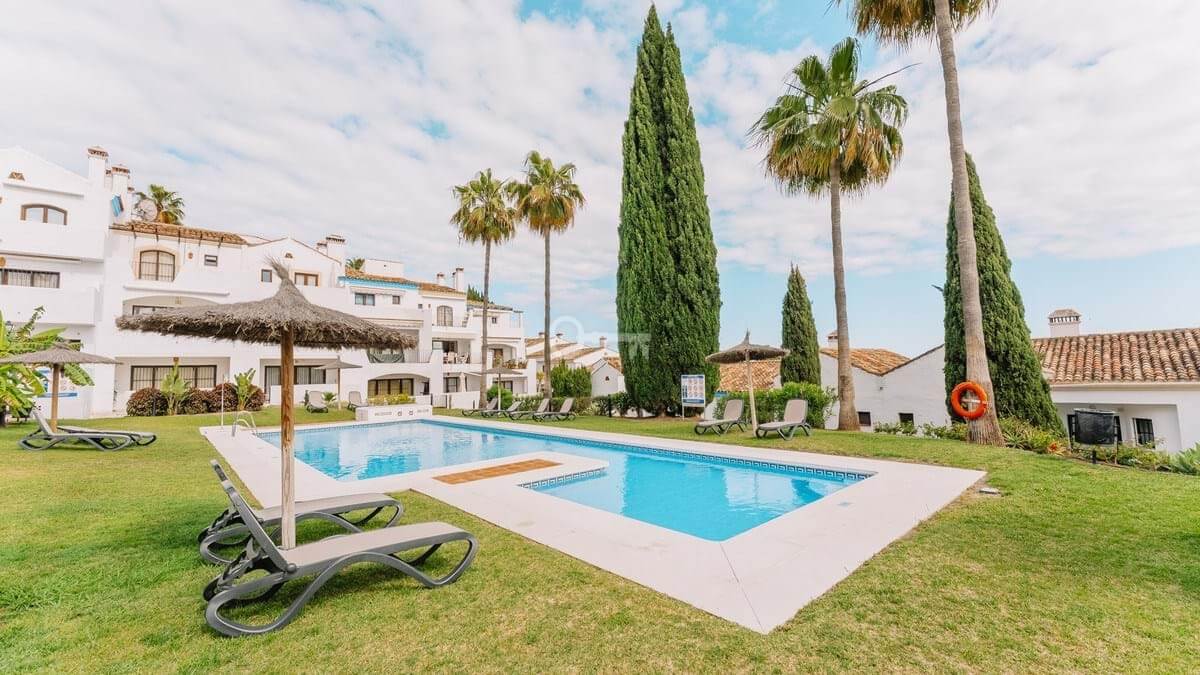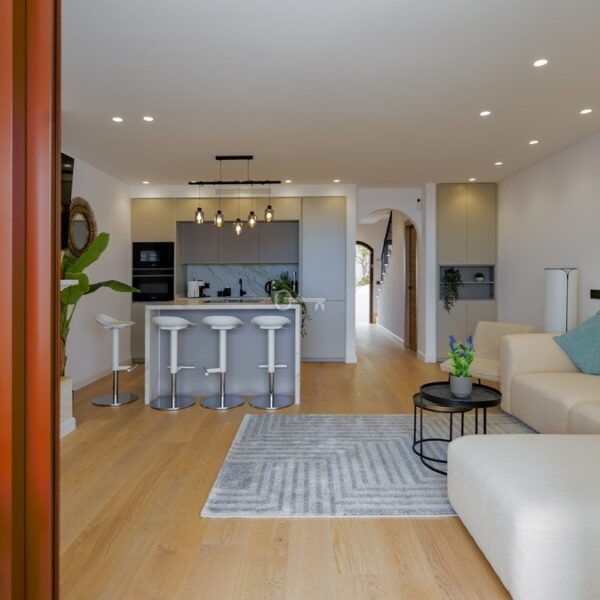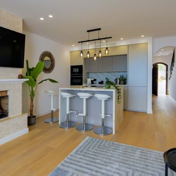 Recently renovated, the townhouse combines traditional Andalusian architectural elements with contemporary interior finishes. The main living level integrates an open-plan kitchen and reception area with floor-to-ceiling sliding glass doors connecting directly to the terrace. The kitchen is equipped with Siemens appliances, and oak flooring runs throughout the principal areas. The layout comprises three bedrooms and three bathrooms distributed across levels to maintain separation between living and sleeping zones. Air conditioning is installed throughout. A private garage with rear storage space is included.