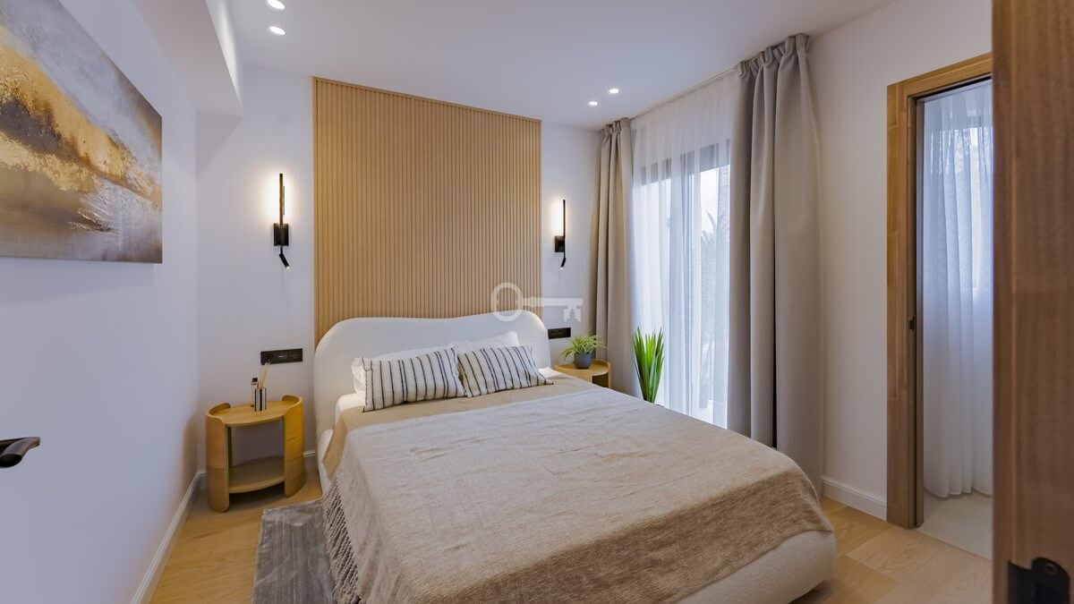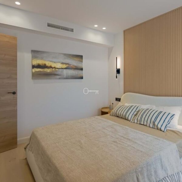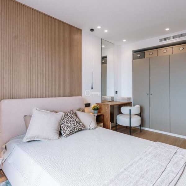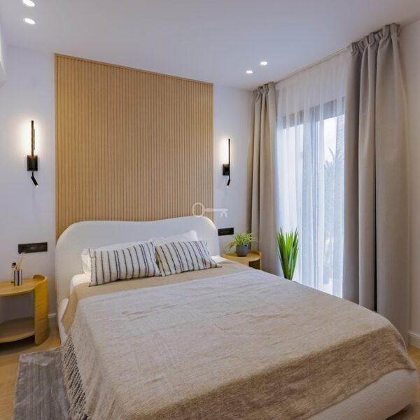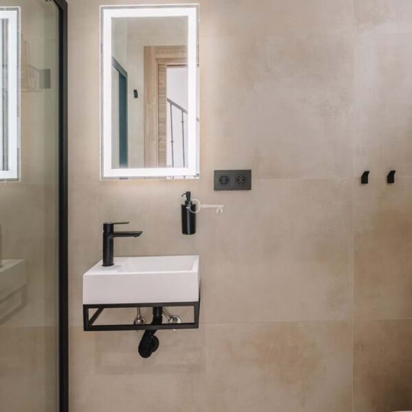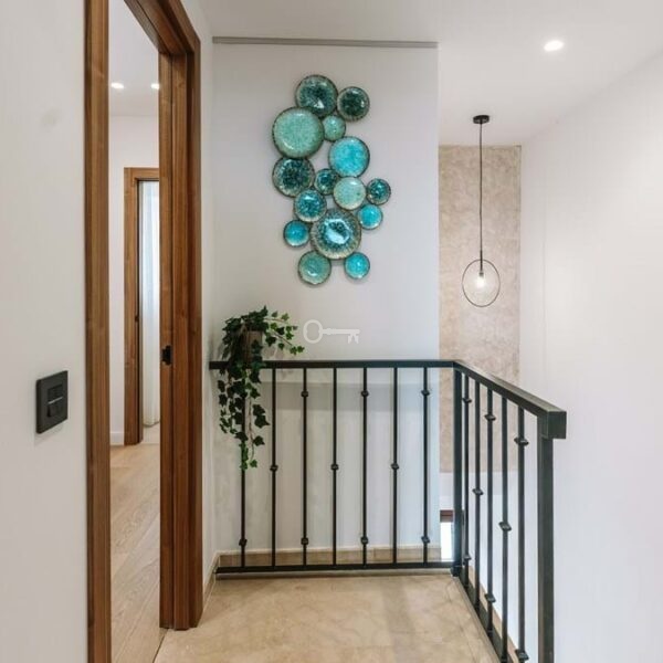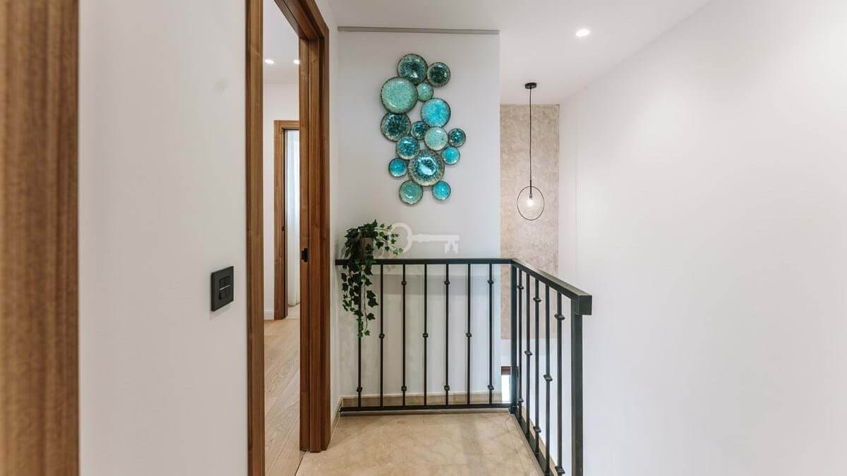 Recently renovated, the townhouse combines traditional Andalusian architectural elements with contemporary interior finishes. The main living level integrates an open-plan kitchen and reception area with floor-to-ceiling sliding glass doors connecting directly to the terrace. The kitchen is equipped with Siemens appliances, and oak flooring runs throughout the principal areas. The layout comprises three bedrooms and three bathrooms distributed across levels to maintain separation between living and sleeping zones. Air conditioning is installed throughout. A private garage with rear storage space is included.