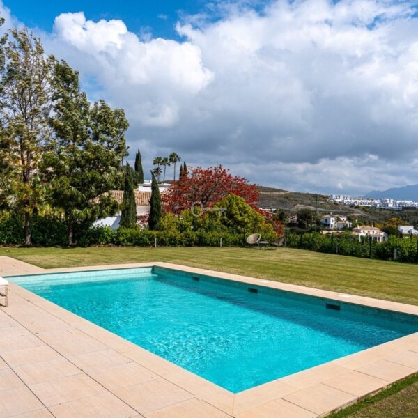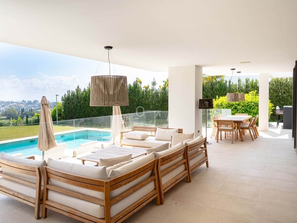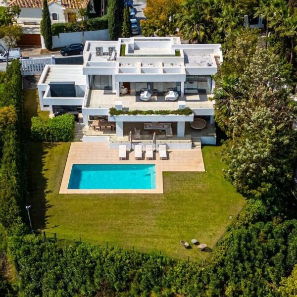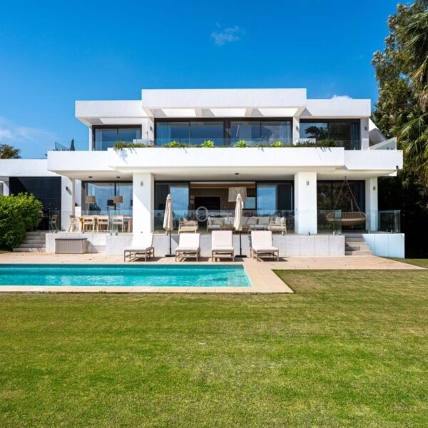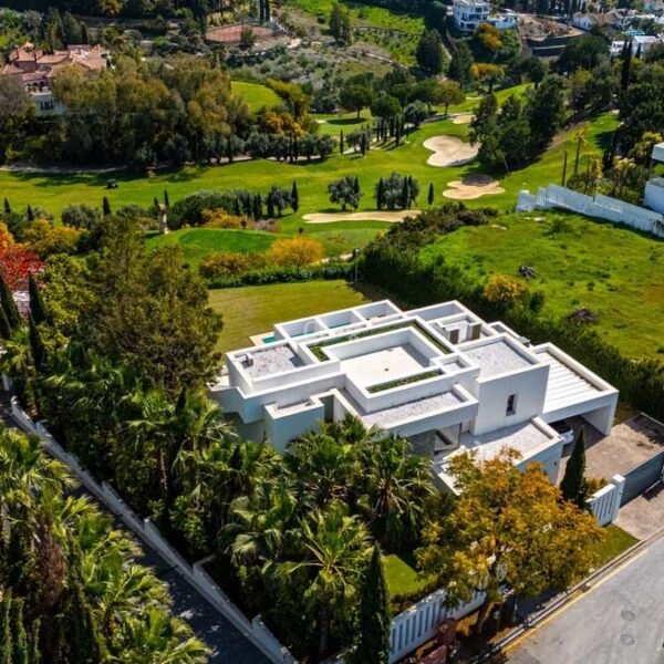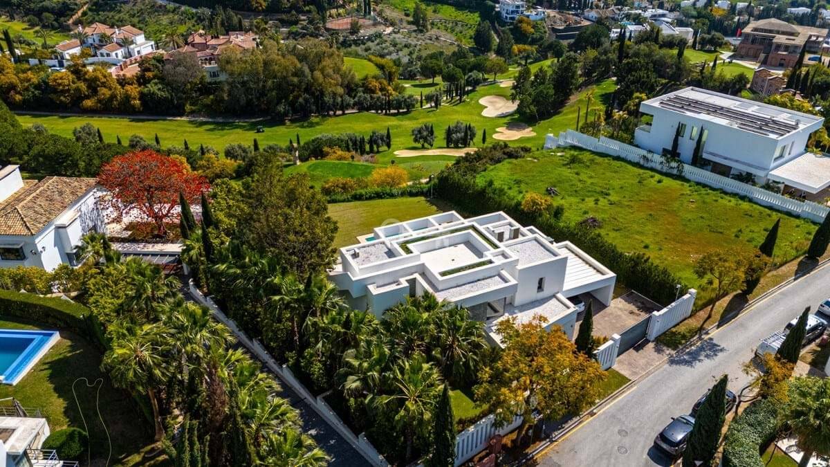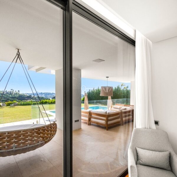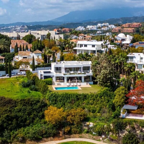 Villa Benvano is a luxury three level villa in Los Flamingos with panoramic golf and Mediterranean sea views. The property offers 4 en suite bedrooms, a private elevator, infinity pool, rooftop terrace, cinema room and gym. The villa comes fully furnished and is located in a secure and prestigious area, ideal for buyers seeking privacy, comfort and high end living near Marbella.