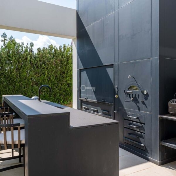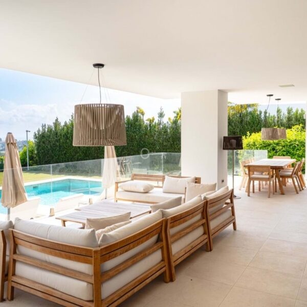 The villa features bright open living spaces with a lounge, dining area and fully equipped kitchen. The main terrace leads to an infinity pool (pre-equipped for a heating system) and outdoor lounge with BBQ area. The master suite includes two walk in wardrobes and a private terrace, while all bedrooms offer en suite bathrooms and natural light.