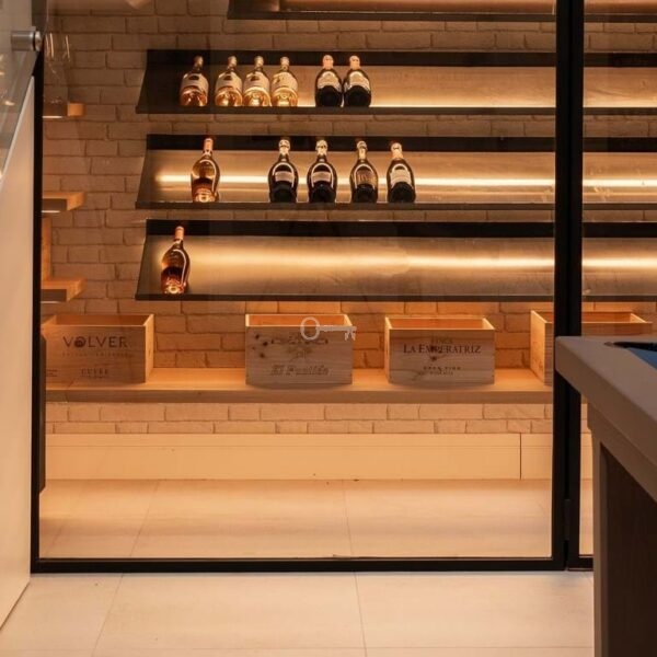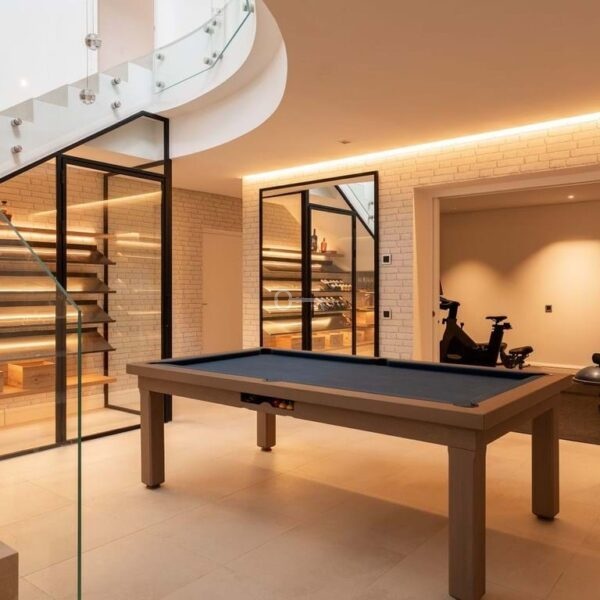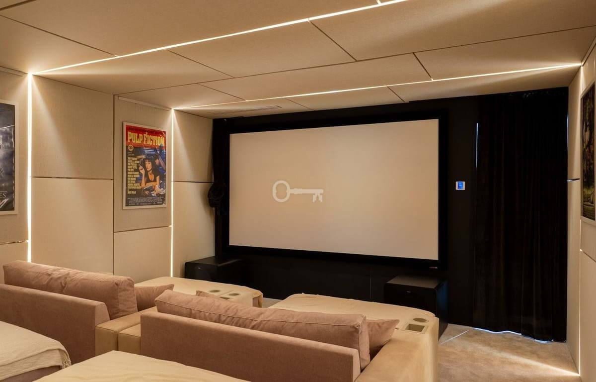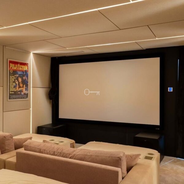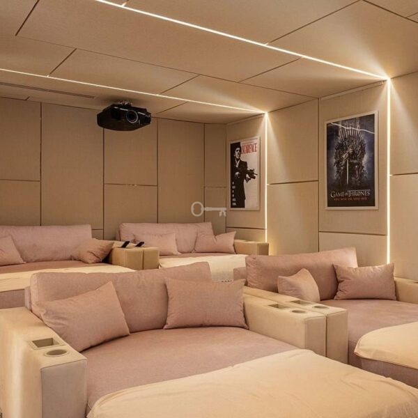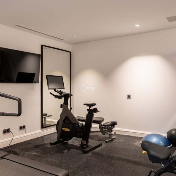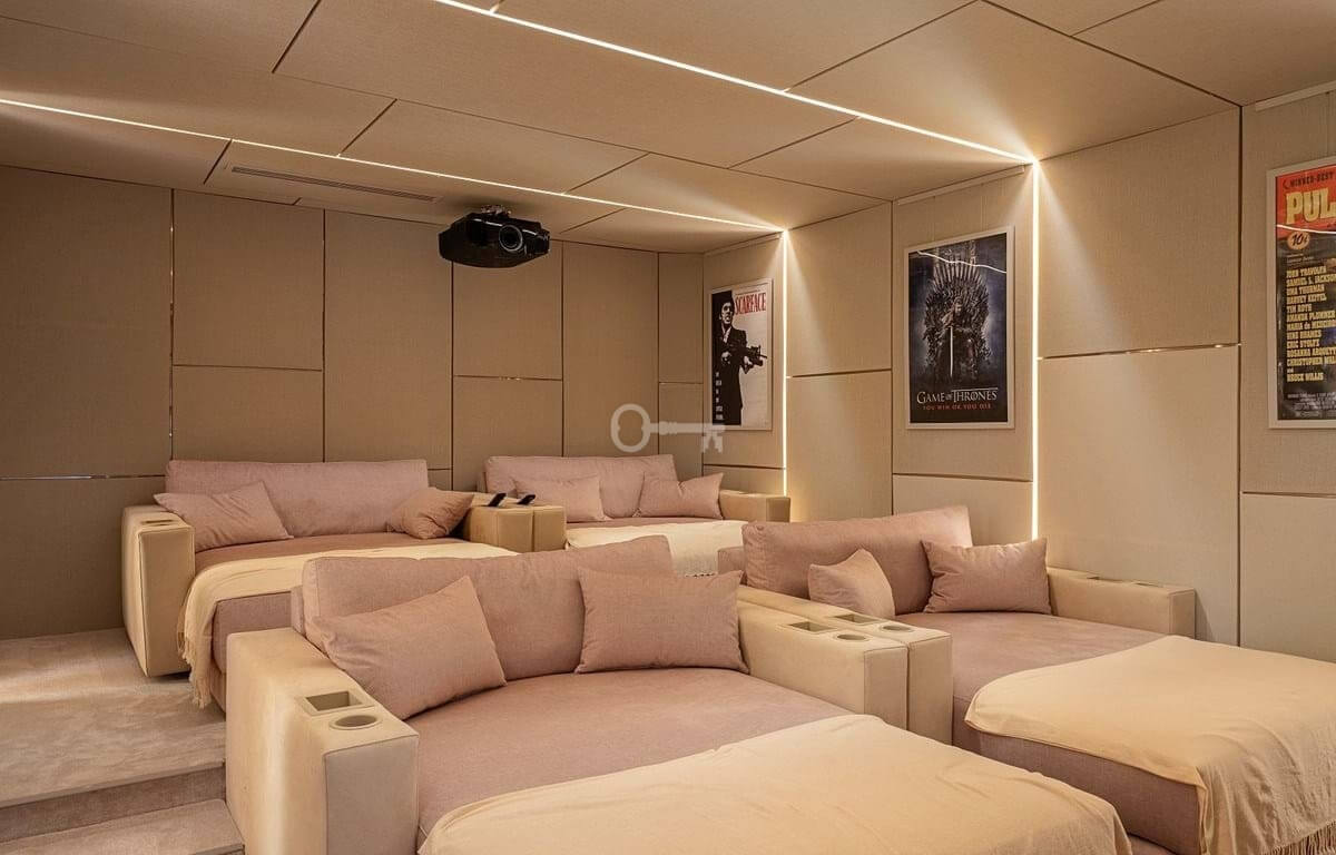 The lower level of the villa provides a fourth bedroom with bathroom, complemented by a variety of leisure facilities. These include a games area, an impressive wine cellar, cinema room, and a fully equipped gym. All three levels of the home are connected by a private lift for added convenience.
