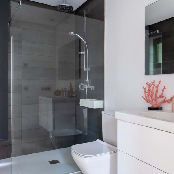 The first floor hosts two additional bedrooms, including the luxurious main suite with two walk-in wardrobes and a large bathroom featuring both a walk-in shower and a freestanding bathtub. Both bedrooms enjoy access to a private terrace with panoramic views of the sea, golf course, La Concha and the surrounding landscape.