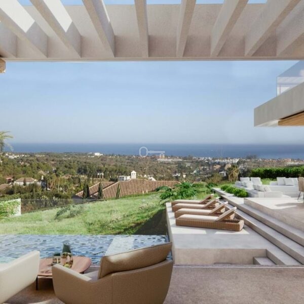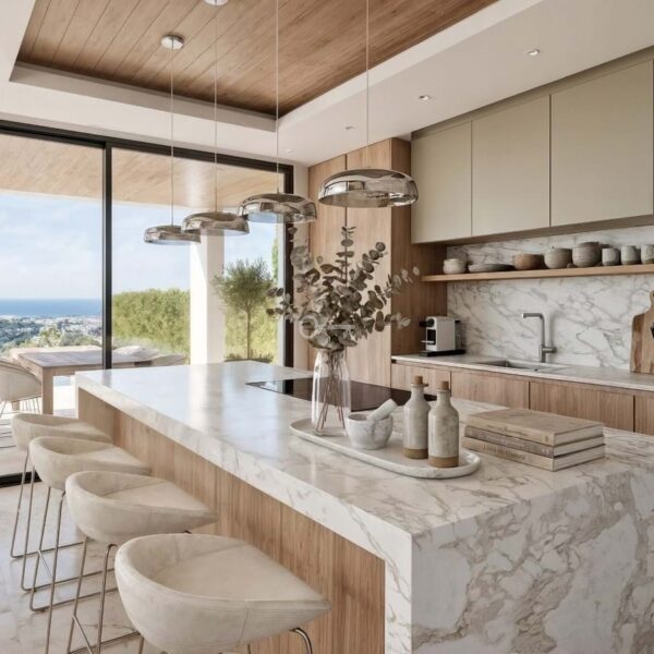 From its elevated position, the villa enjoys breathtaking panoramic views of the Mediterranean Sea, the golf course and the surrounding natural landscape. Its orientation and architectural design have been carefully conceived to maximise natural light and enhance the visual connection with the environment, creating spaces that convey calm, openness and exclusivity.