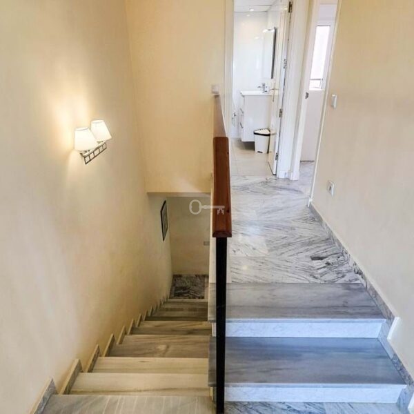 The townhouse is arranged over two levels and features three bedrooms, two bathrooms, and a guest WC, providing a practical layout for both everyday living and hosting family or guests. The main living area opens onto a private garden, where the sea views create a natural extension of the home ideal for outdoor dining, relaxing, or simply enjoying the surroundings.
