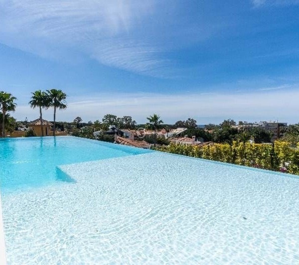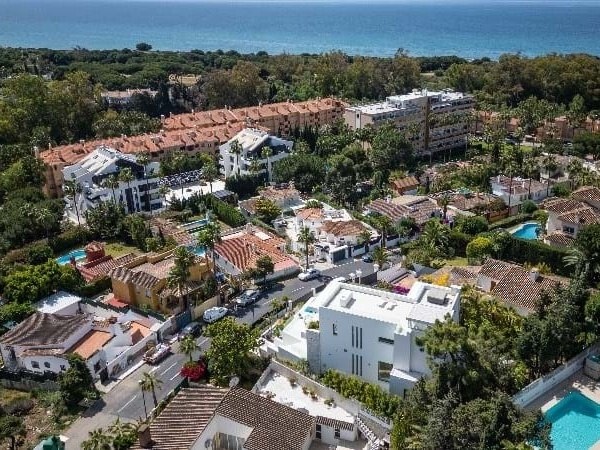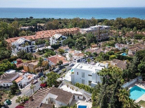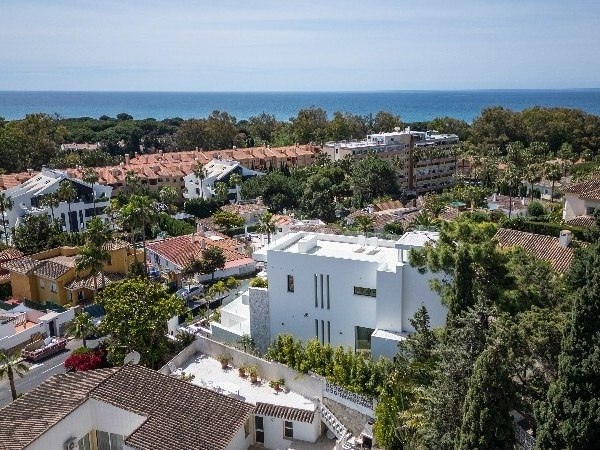 Fabulous eco-friendly family villa in Marbesa, known for its beautiful beaches and convenient location near amenities and the protected nature reserve of the dunes of cabopino with the marina nearby. Set on a spacious plot with palm trees and tropical plants, this stunning, south-facing villa boasts underfloor heating. Almost every room offers fantastic sea views of the Mediterranean and the African coastline.